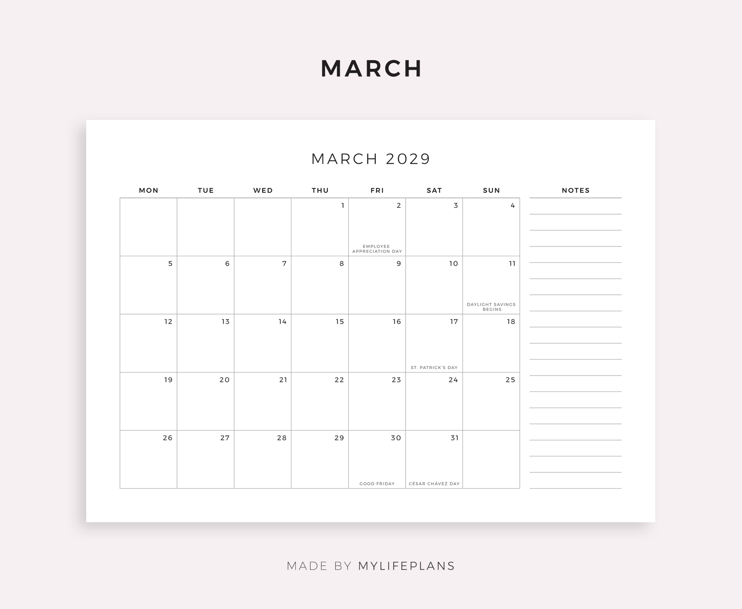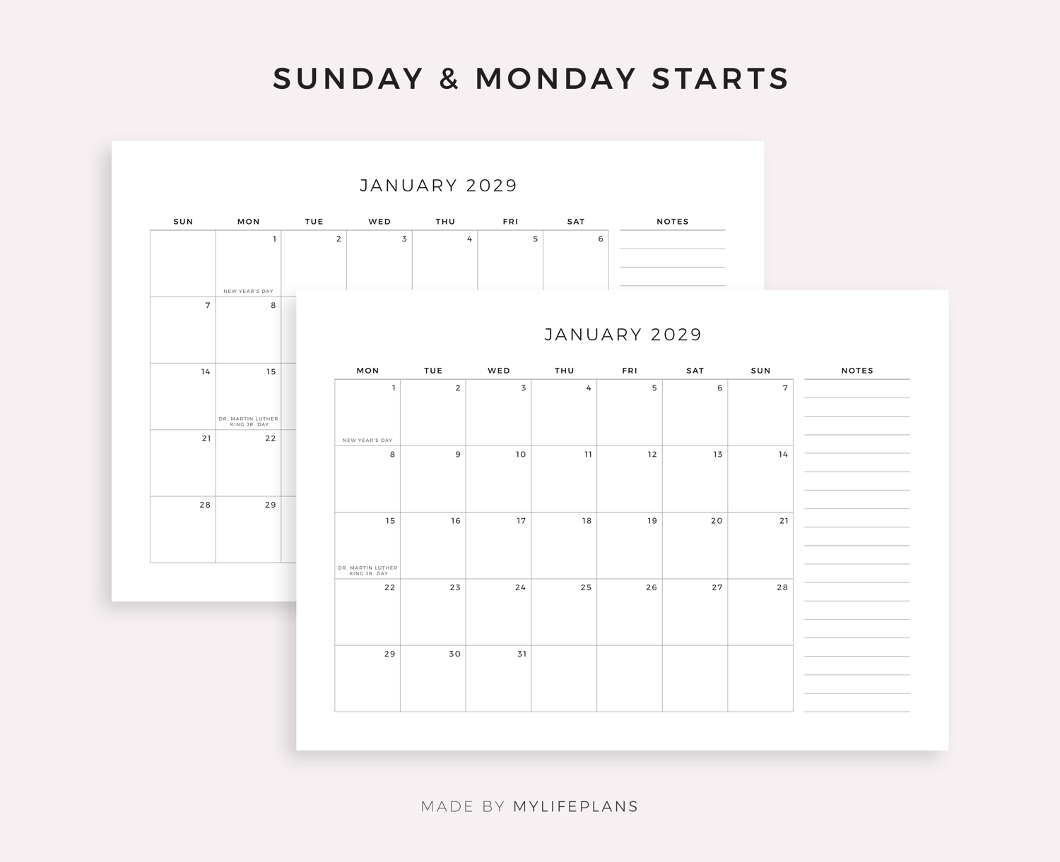 This is a printable 2029 monthly calendar with holidays & notes — just download, print, and start using it right away.