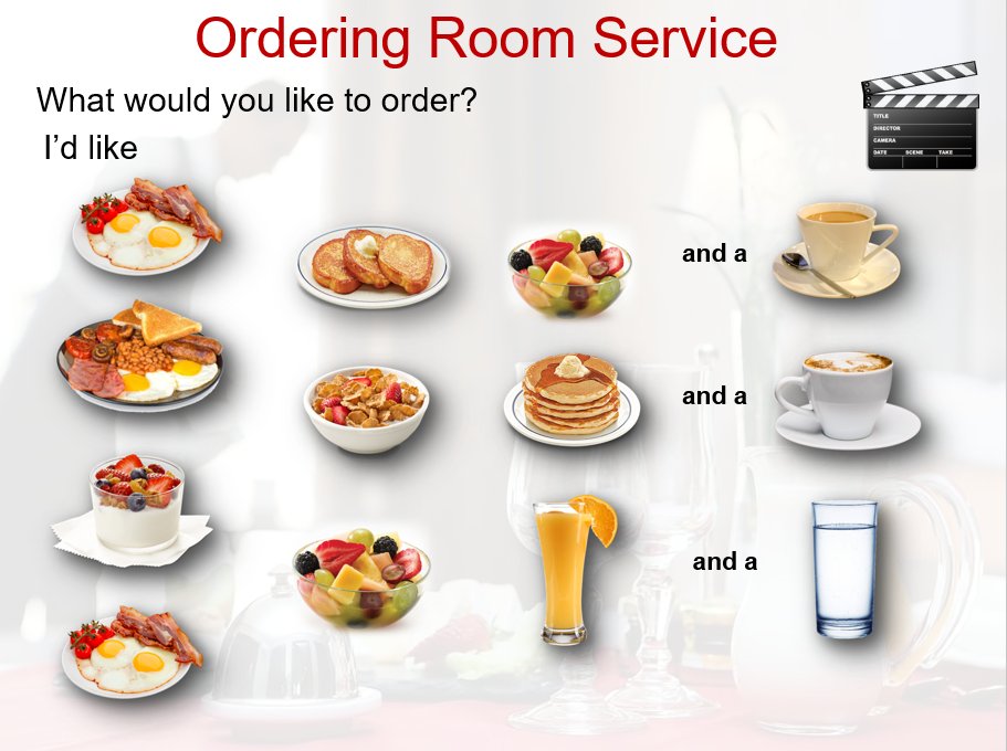 - Room service: order, menu, soup, sandwich, drinks, please, thank you