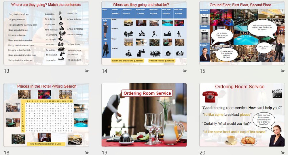 ✅ Includes: guest check-in role-plays, room service tasks, facility directions, polite requests