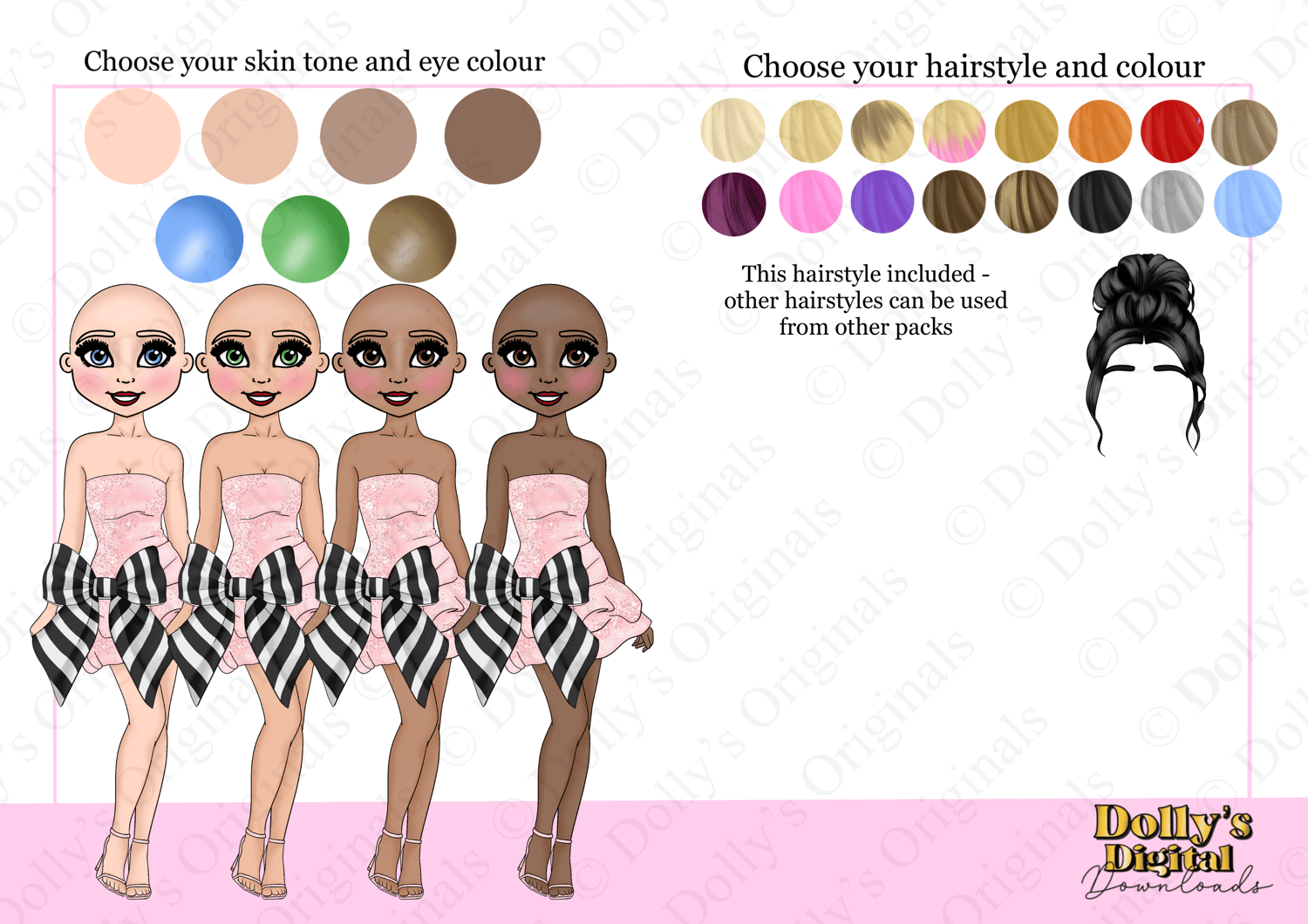 Instant digital download of our Pink Dress and Black and White Bow Dolly Character Bundle PNG (32 PNG’s)
