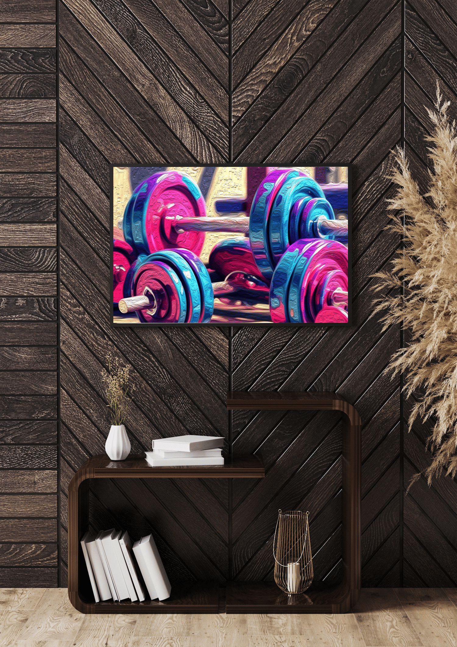 The setting appears to be indoors with what looks like exercise equipment or gym infrastructure visible in the background. The lighting creates some depth and contrast in the image, emphasizing the three-dimensional quality of the weights and their arrangement.