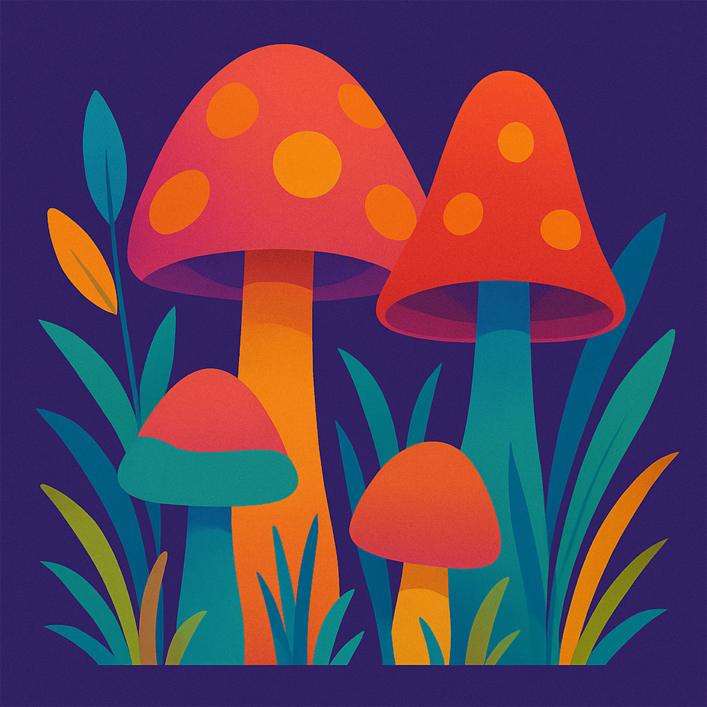 “Nature’s Delicate Bloom” illustrates an image of mushrooms with varying size and patterns. The style is simplistic and vector-like in appearance. The use of a plain contrasting violet background allows the subjects to stand out and become the sole focus for the viewers. The title alludes to the fragility and beauty in nature. The curves of the mushrooms evoke a sense of softness that we can relate to the delicate parts of nature. The overall appearance of the image is pleasing and a delight to look at.