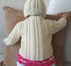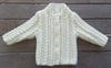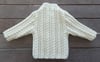This gorgeous Jacket for baby is worked in 8ply/DK yarn, in a four row cable pattern, with textured rib bands. It has set in sleeves and a round neck. It is photographed in size 0 months.