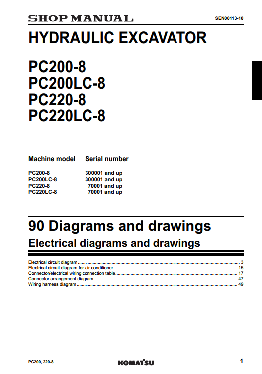 Table of Content of the Komatsu Excavator PC200-8, PC220LC-8, PC220-8, PC220LC-8