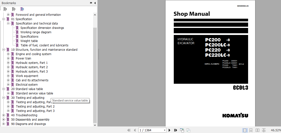 Komatsu PC200-8, PC220LC-8, PC220-8, PC220LC-8 SHOP REPAIR MAINTENANCE PDF MANUAL, 300001 and up, 70001 and up