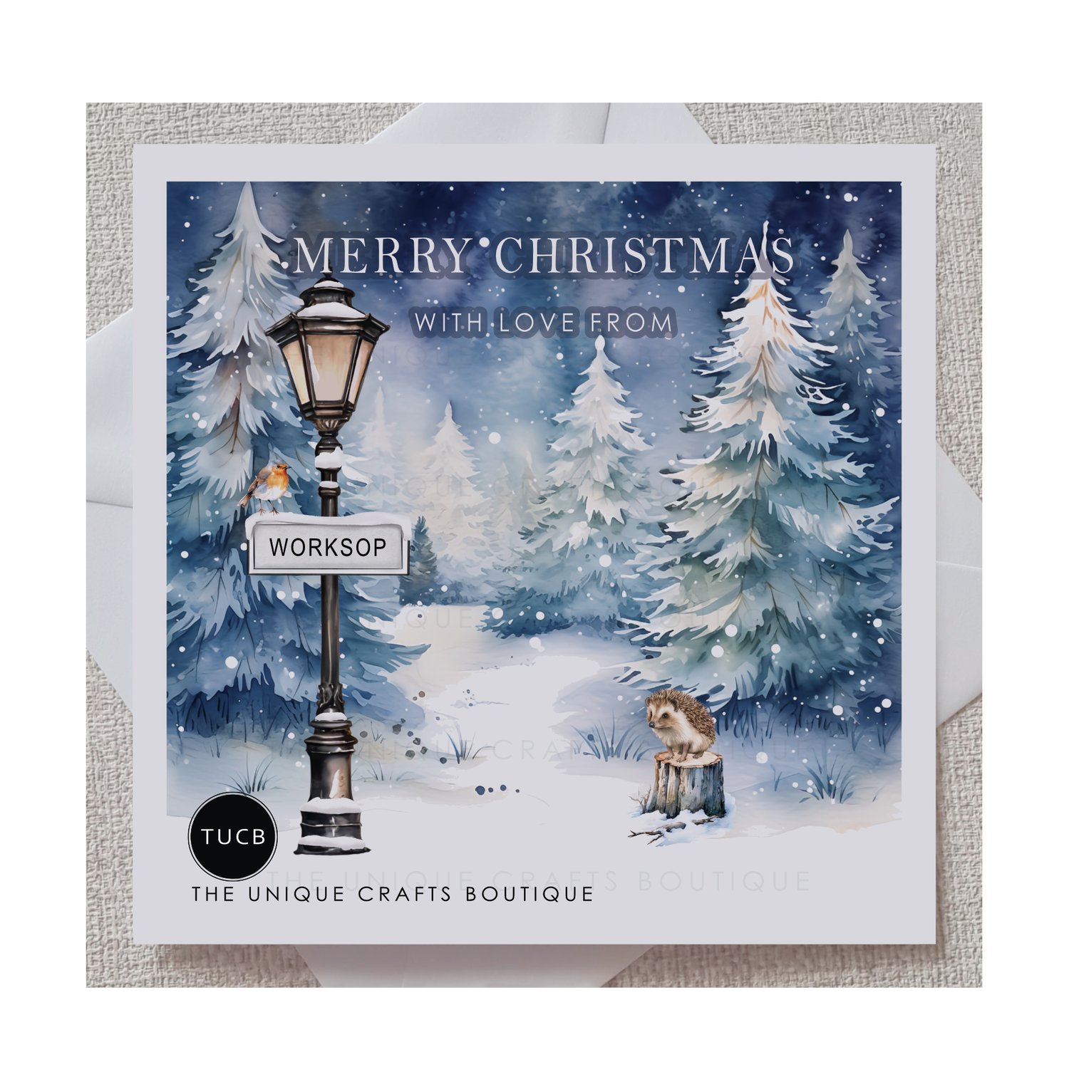 Printed with a beautiful snowy Winter woodland. A sweet little Robin is perched on the signpost which displays 'Worksop' and a lost little hedgehog is sat on an old tree stump taking in the scene. The greeting 'Merry Christmas with love from' is displayed above in the night sky.