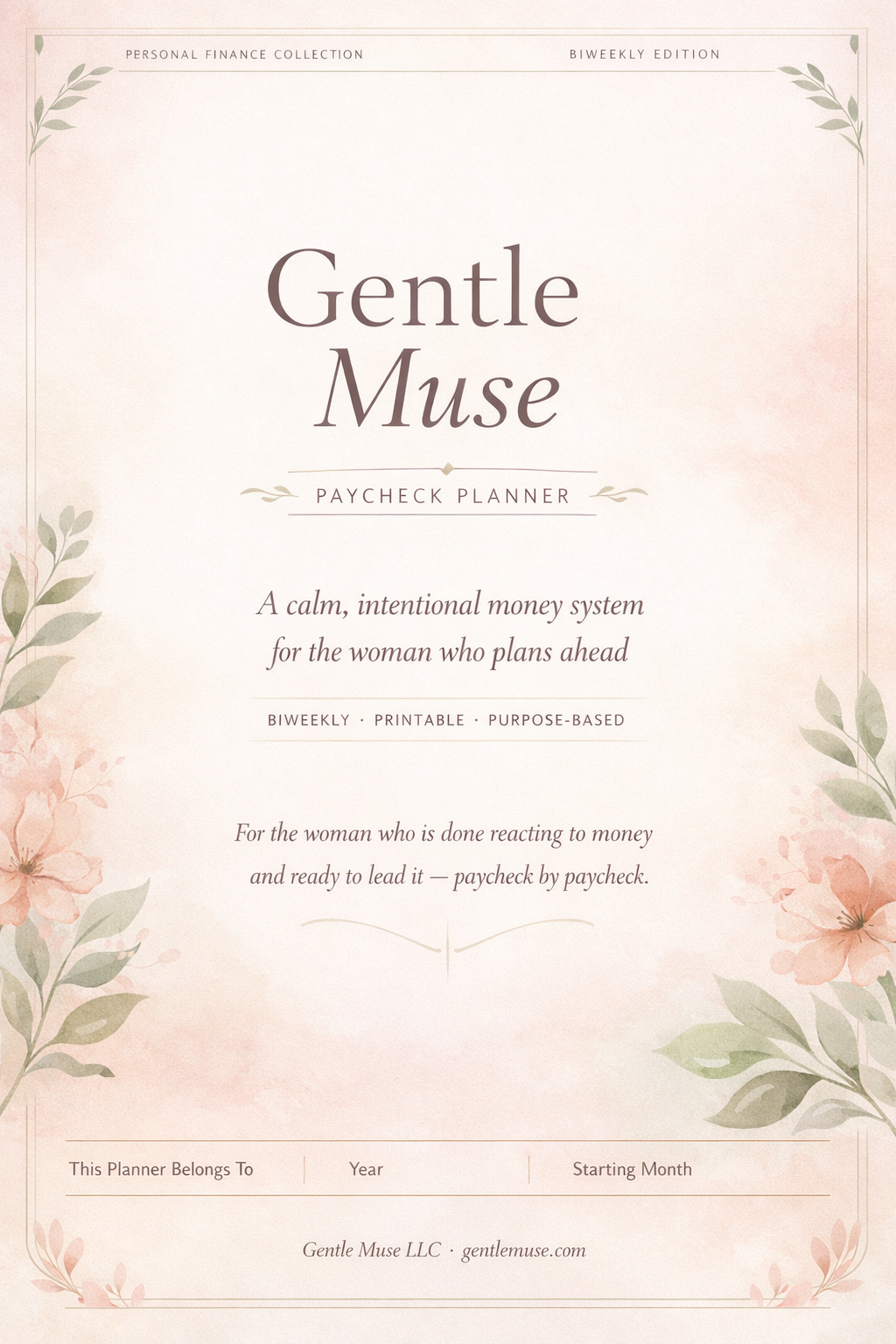 The Gentle Muse Paycheck Planner is a printable budgeting workbook built around your real paycheck schedule — so you can plan ahead, stay on top of bills, and use each paycheck with more intention.