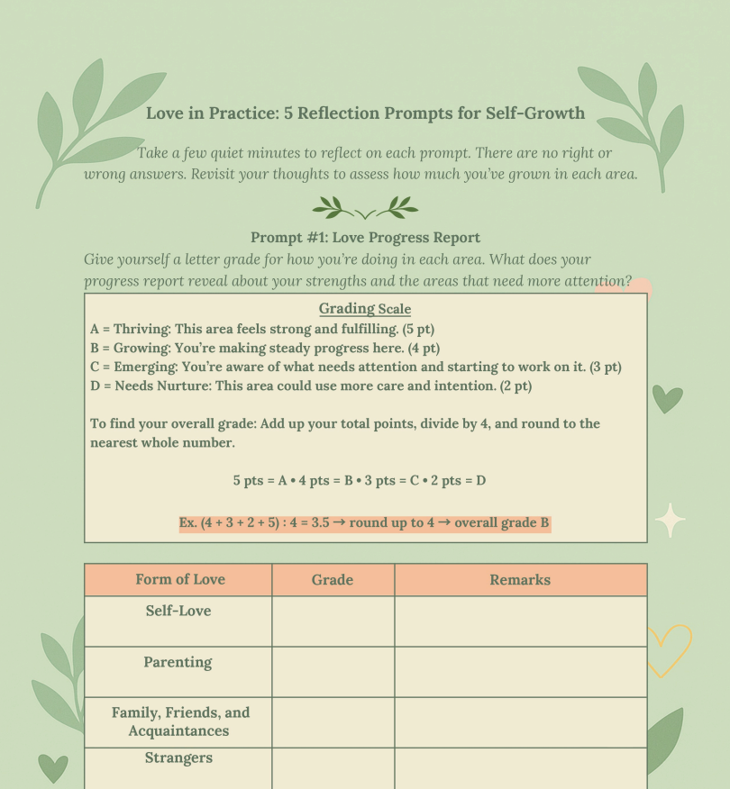 - 5 guided reflection prompts designed to help you explore love as a daily practice