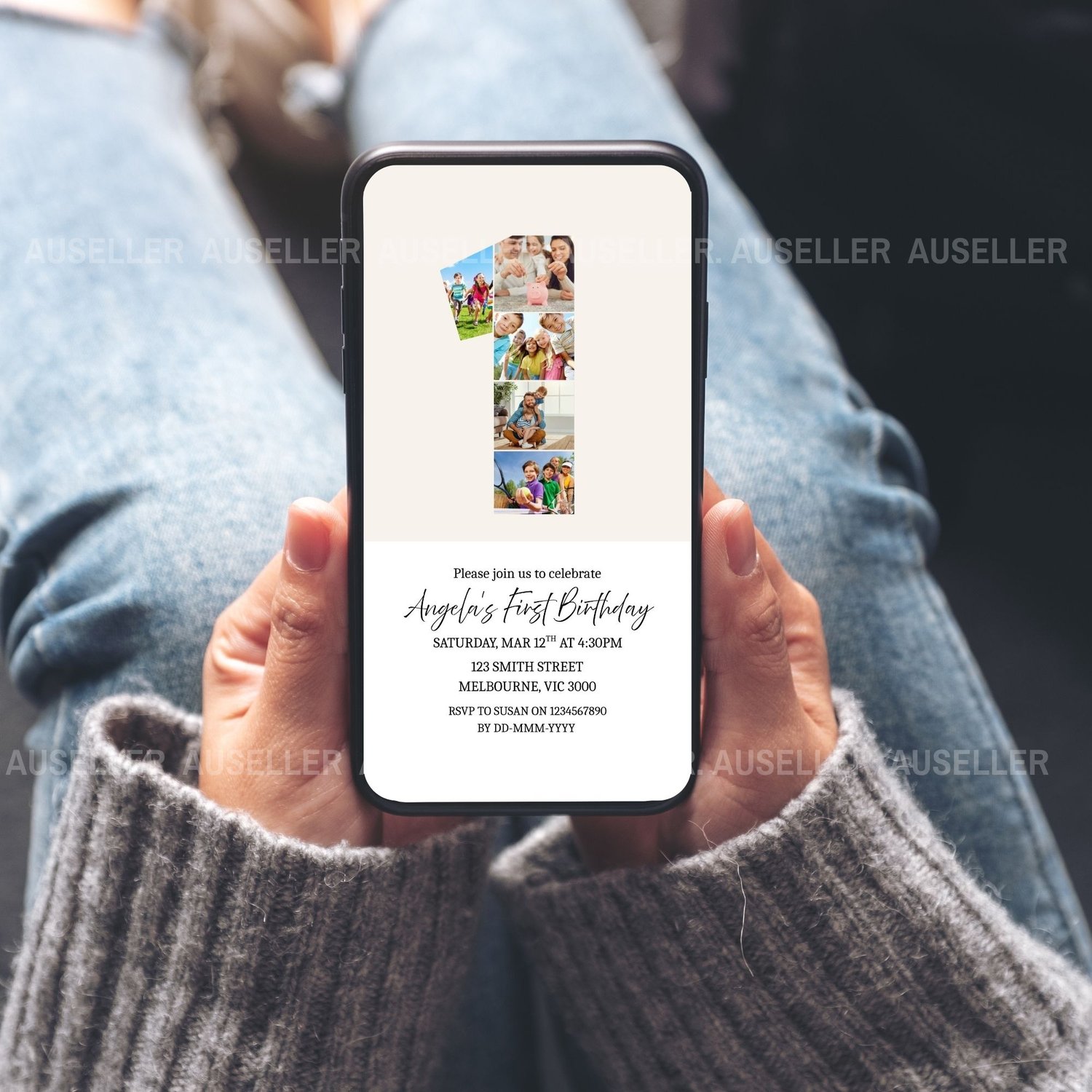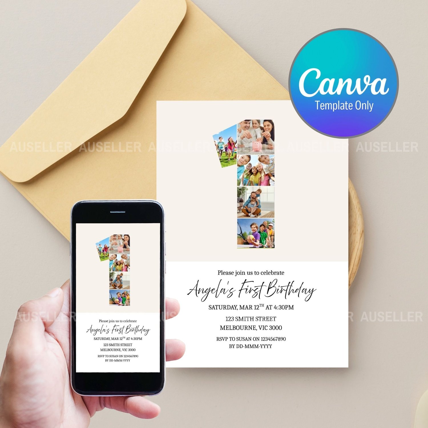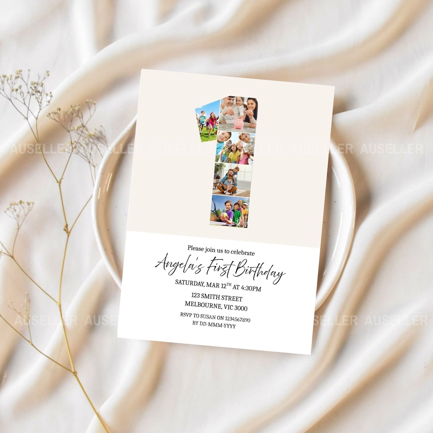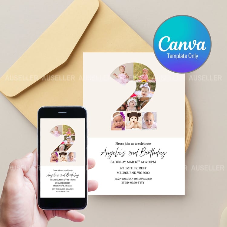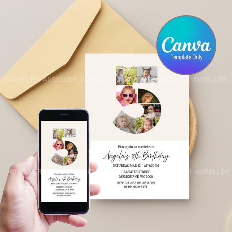 Celebrate your little one's biggest milestone with this beautifully designed editable first birthday invitation! Featuring a unique number '1' photo collage design, this invitation lets you showcase five of your best images of your baby creating a heartwarming and personal touch your guests will love. This minimalist design is the perfect invitation for boys or girls. Whether you're planning a cozy gathering or a big celebration, this invitation is a perfect way to kick off your baby’s first birthday in style. Easy to personalise and make your own!