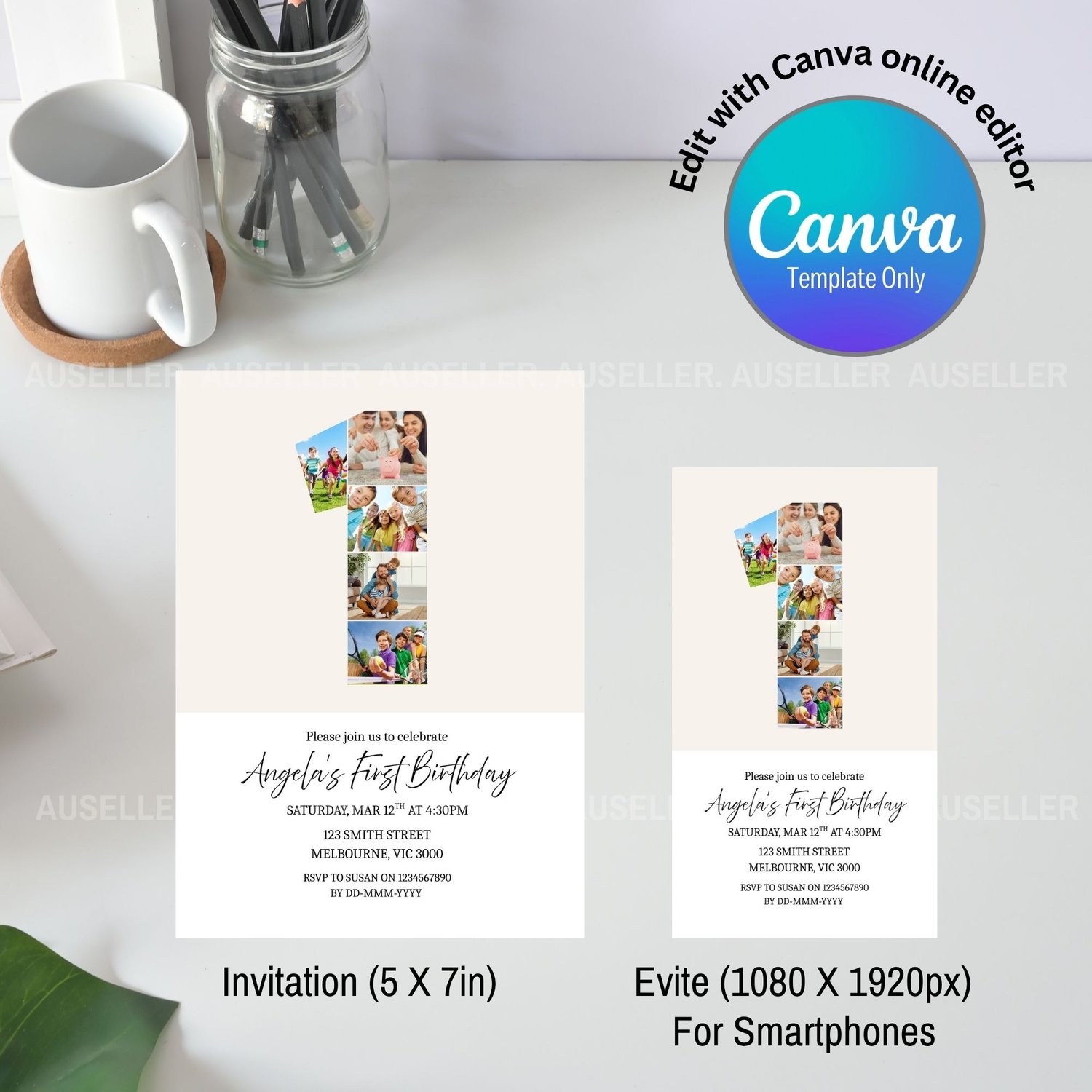 1st Birthday Photo Collage Editable Invitation Template