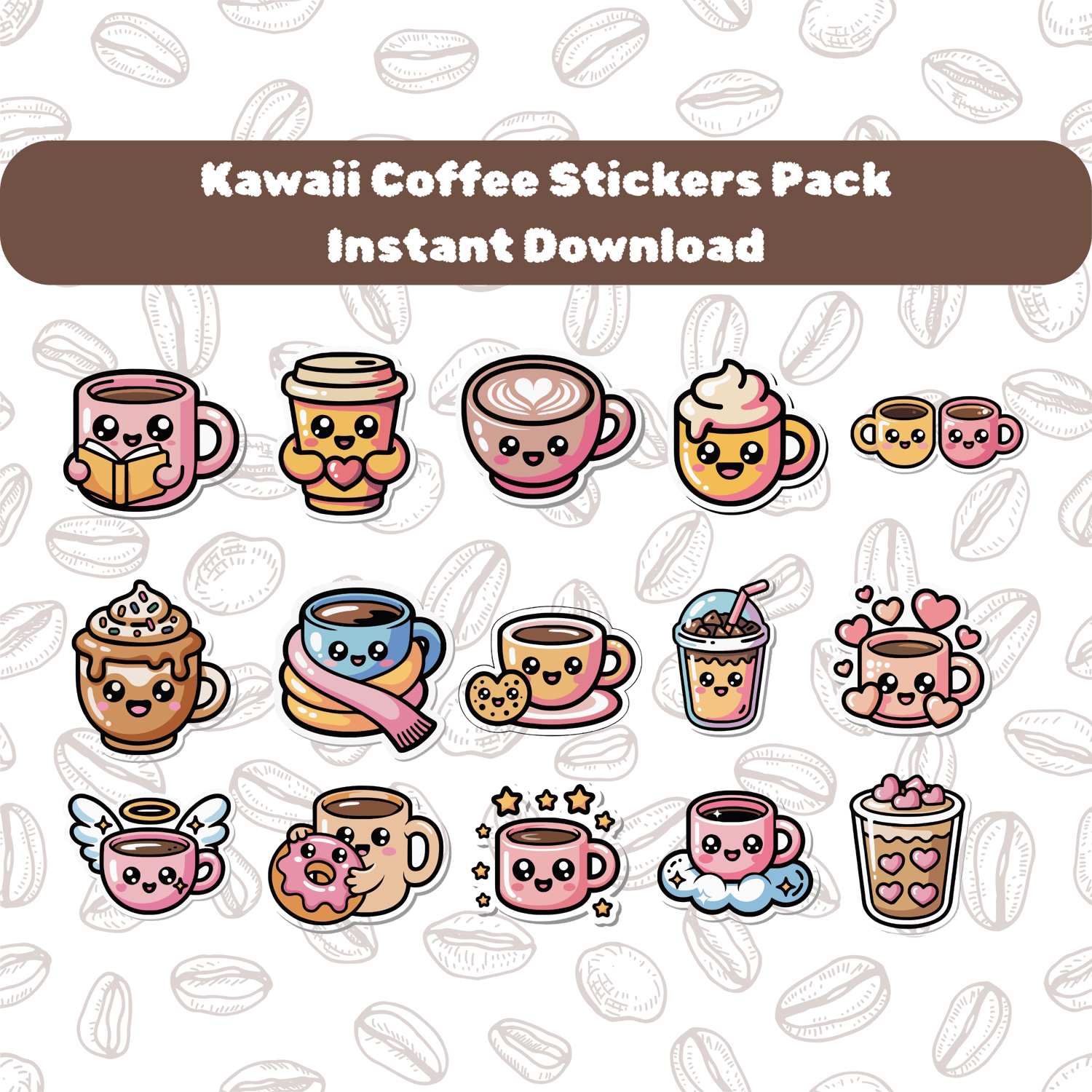 This collection includes 15 kawaii coffee themed stickers such as coffee mugs, latte cups, iced coffee and cute drinks.