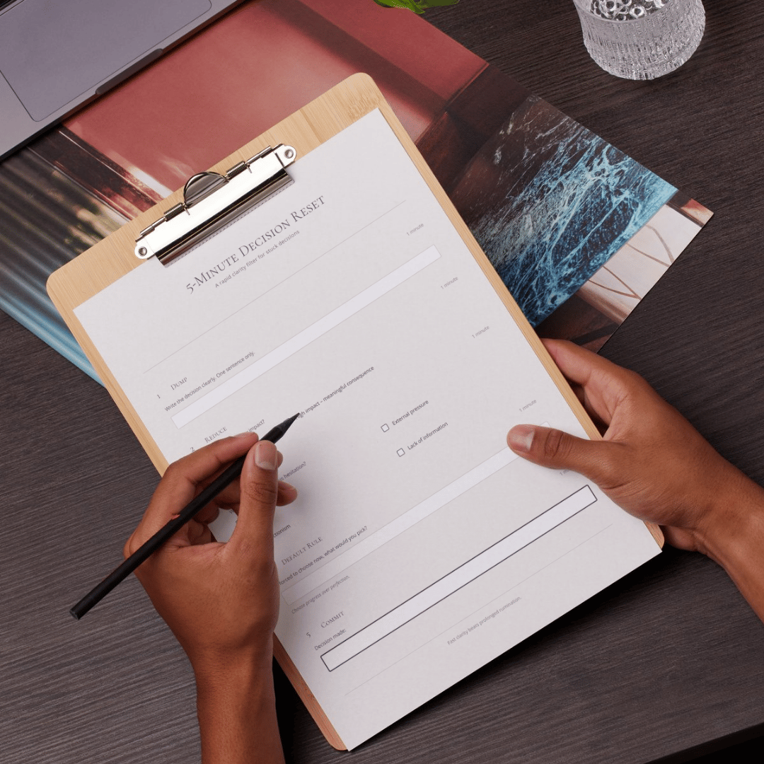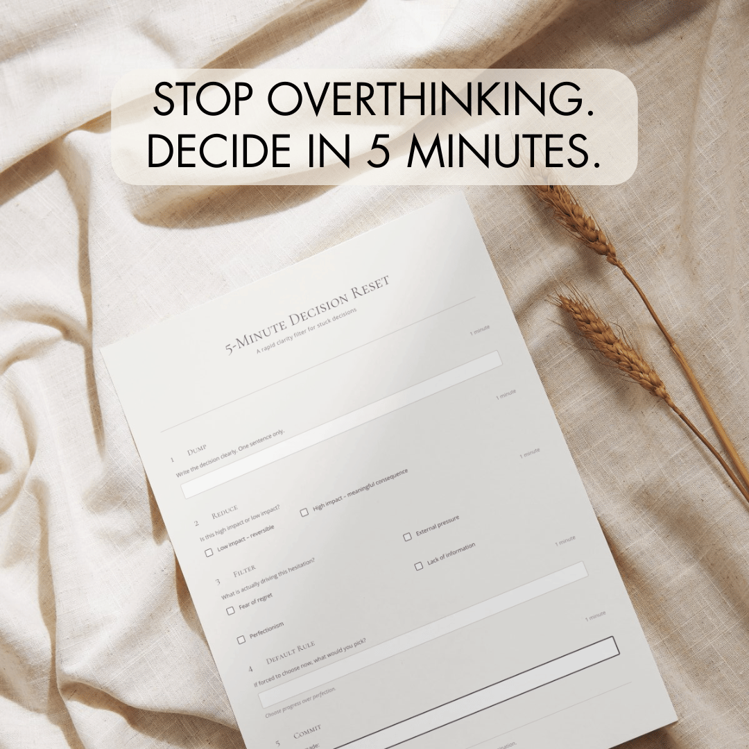 The 5-Minute Decision Reset is a structured worksheet designed to help you evaluate and finalize decisions quickly without mental spiraling.