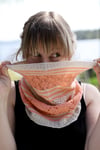 Heinä is a light and mellow little cowl project. It uses a linen blend in two colors and plays with stripes and different lace patterns.