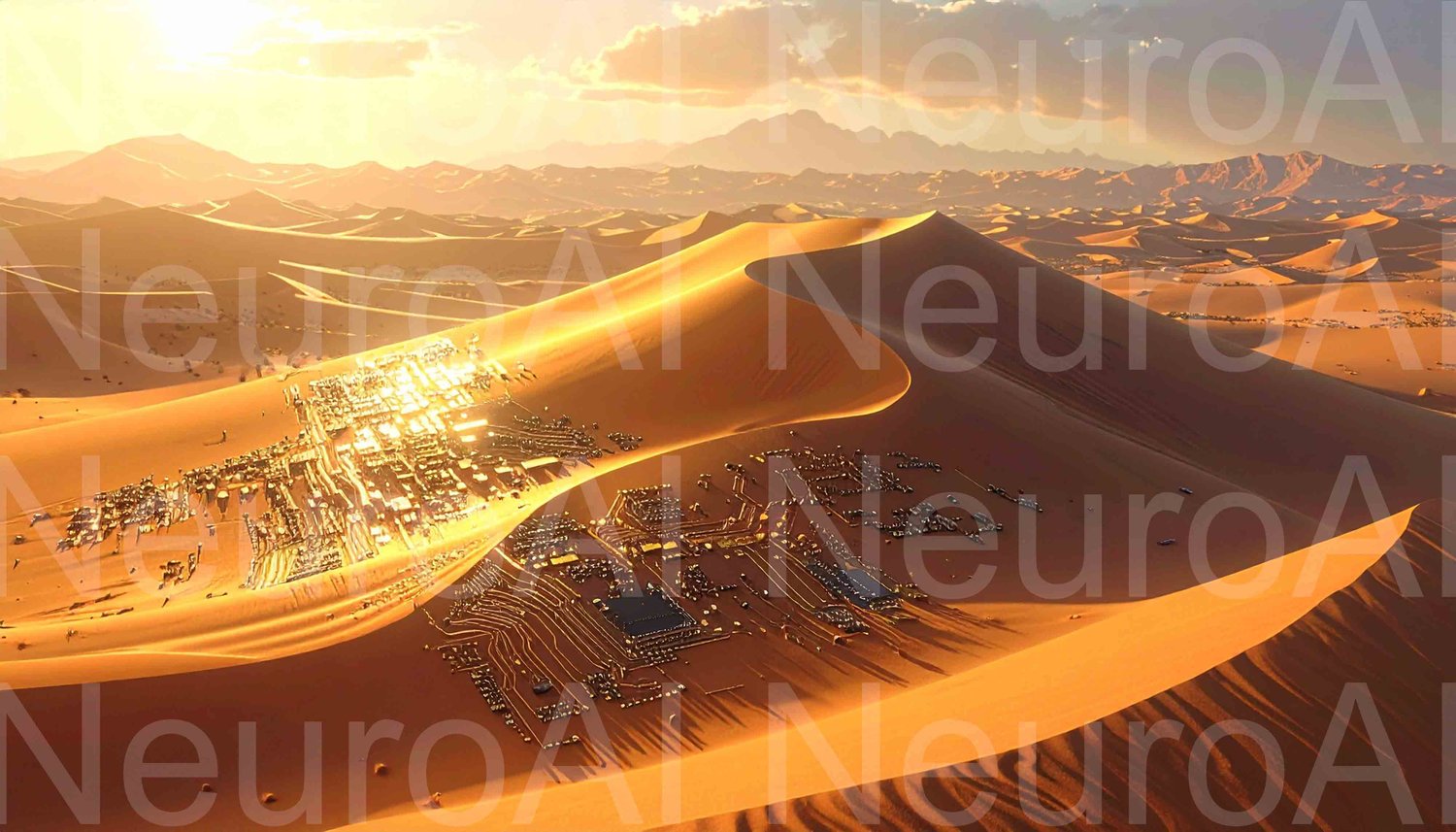 Desert circuit board landscape at sunset