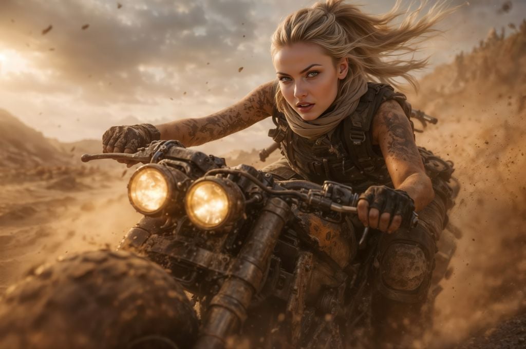 - Cinematic grit: battle-worn metal, dust-stained skin, that “one last run before sundown” atmosphere