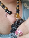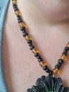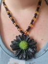 Bold, radiant, and effortlessly groovy — the Flower Powers necklace is here to make a statement. Featuring rich amber-toned beads paired with textured black clay and shimmering pearlescent black accents, this piece oozes retro charm with a dark, modern twist.