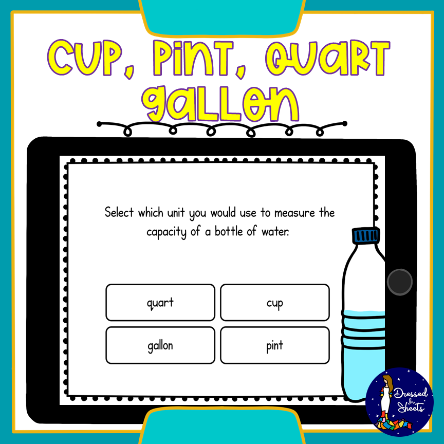 Students will review what a cup, pint, quart, and gallon look like. They will also get to know how many cups go in a pint, how many pints in a quart, how many quarts in a gallon. Once they review this important information they will take a quiz in which they will tell which measure of liquid capacity is best suited for each scenario.