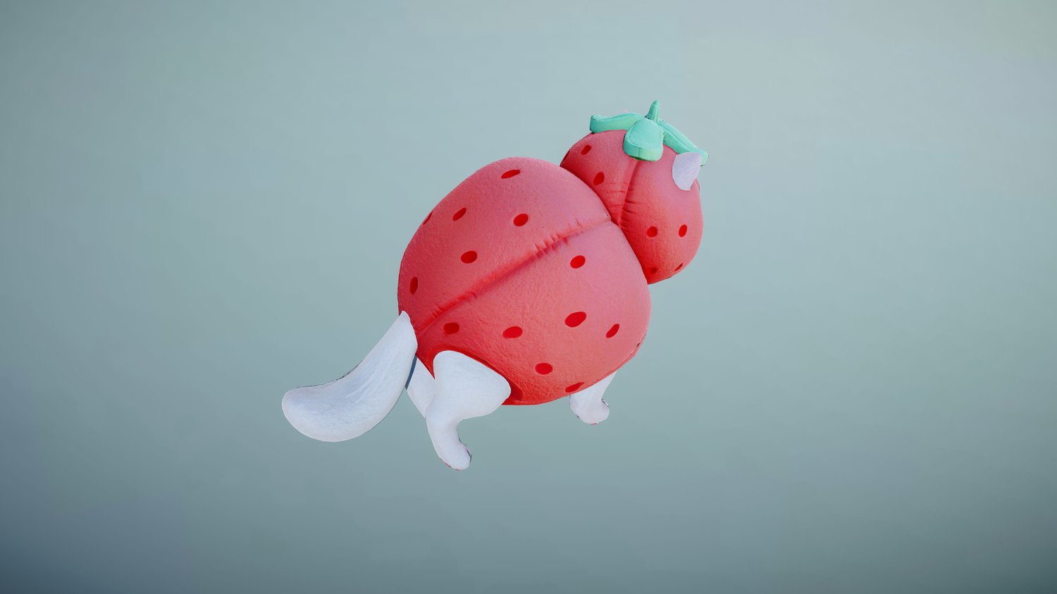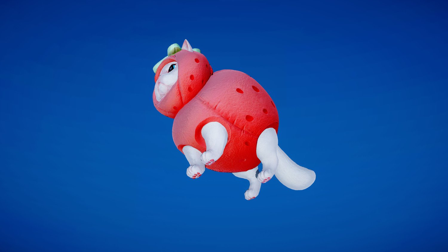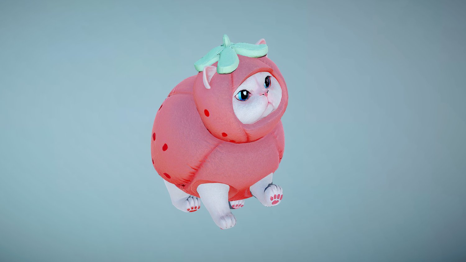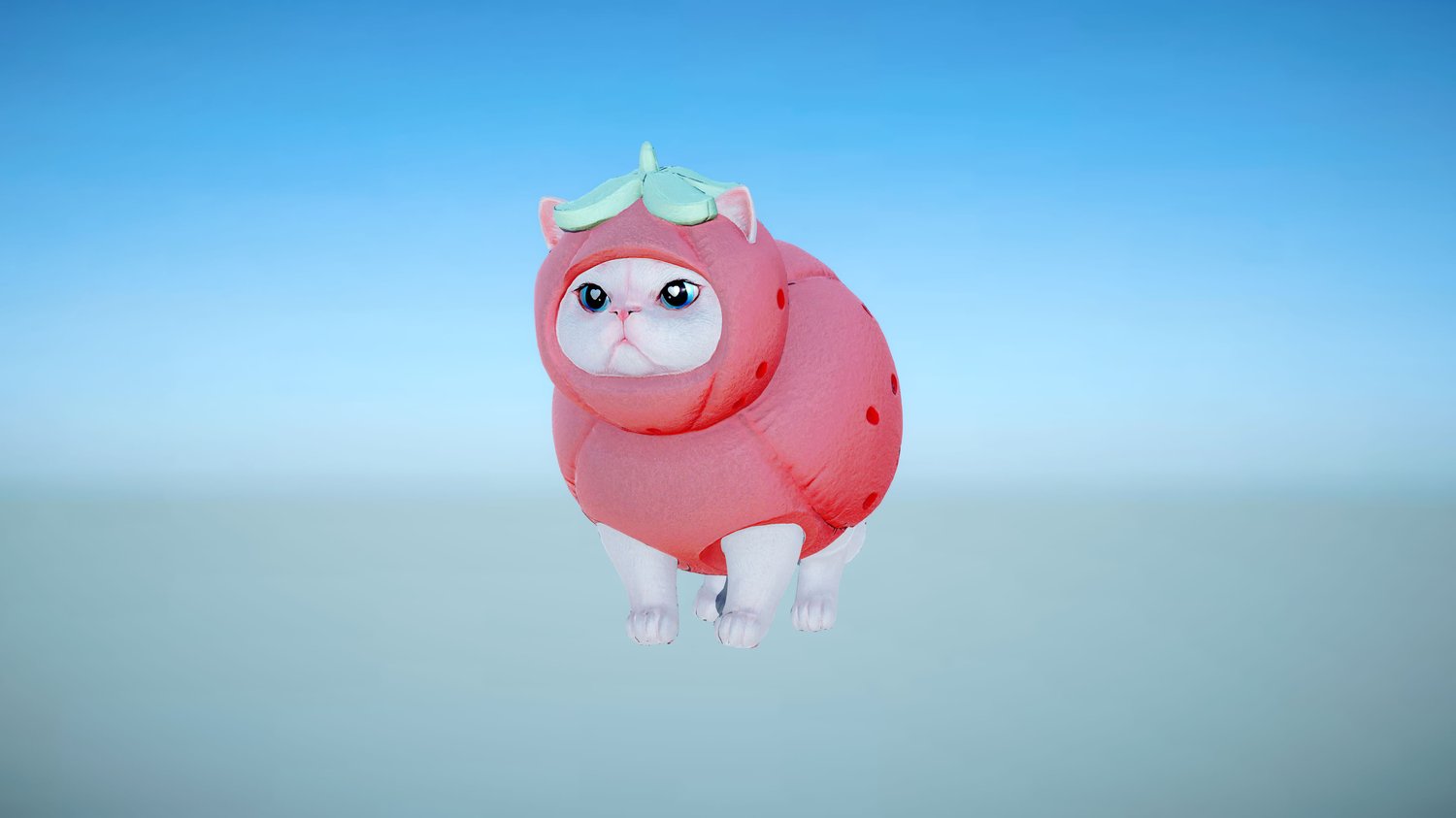 A beautiful and fluffy kitten in a strawberry outfit, fully articulated.