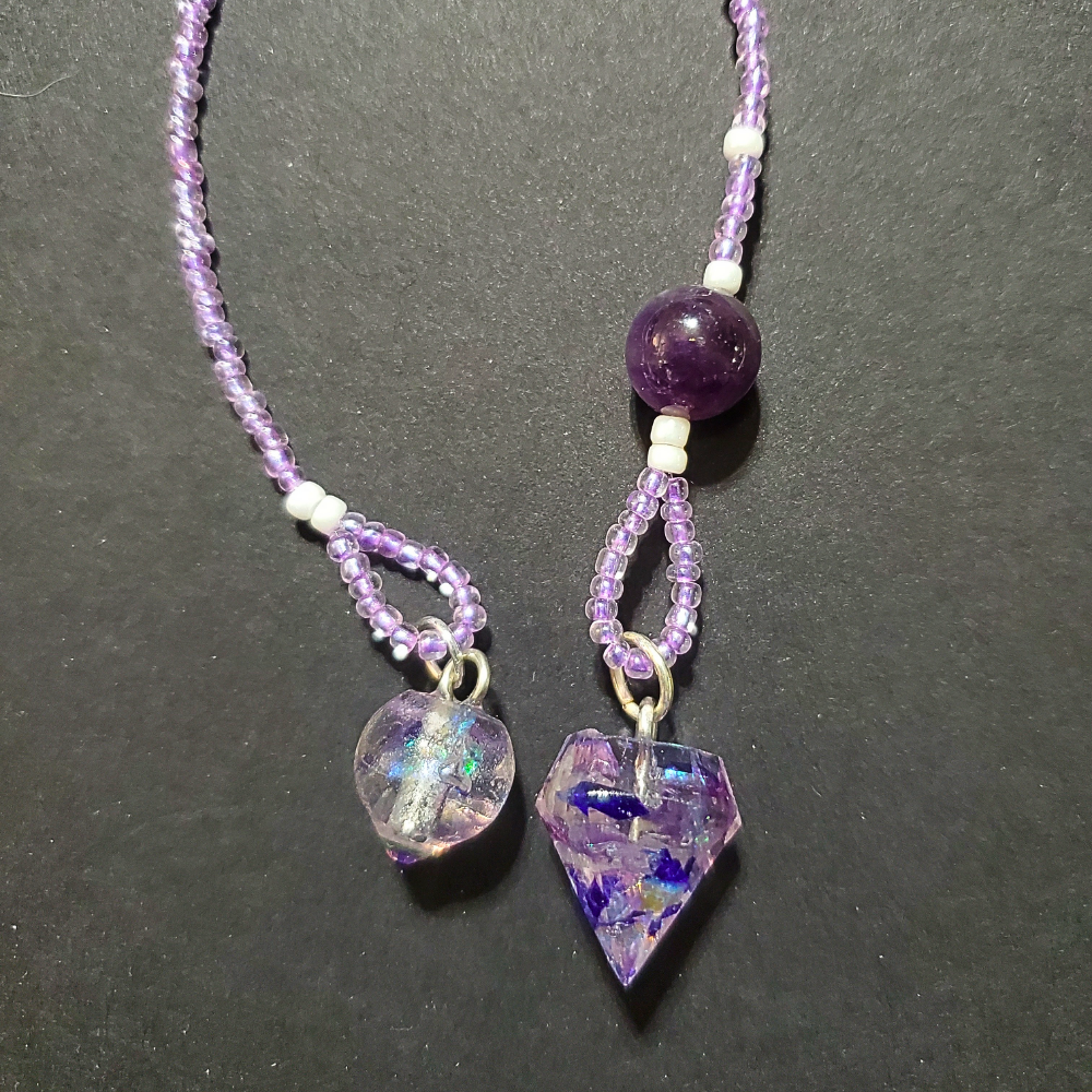 This pendulum is handmade from clear resin with purple flakes and embedded with amethyst chips. Ships with instructions