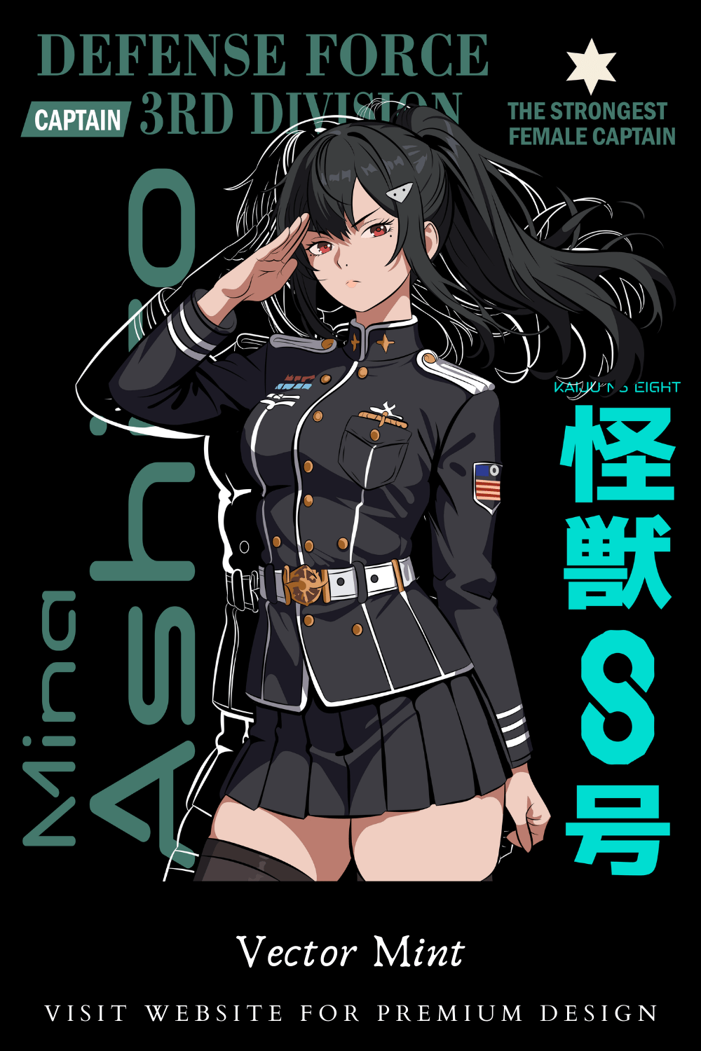 Mina Ashiro Kaiju No 8 Anime Streetwear Graphic PNG Defense Force Captain Manga Waifu T-Shirt Design