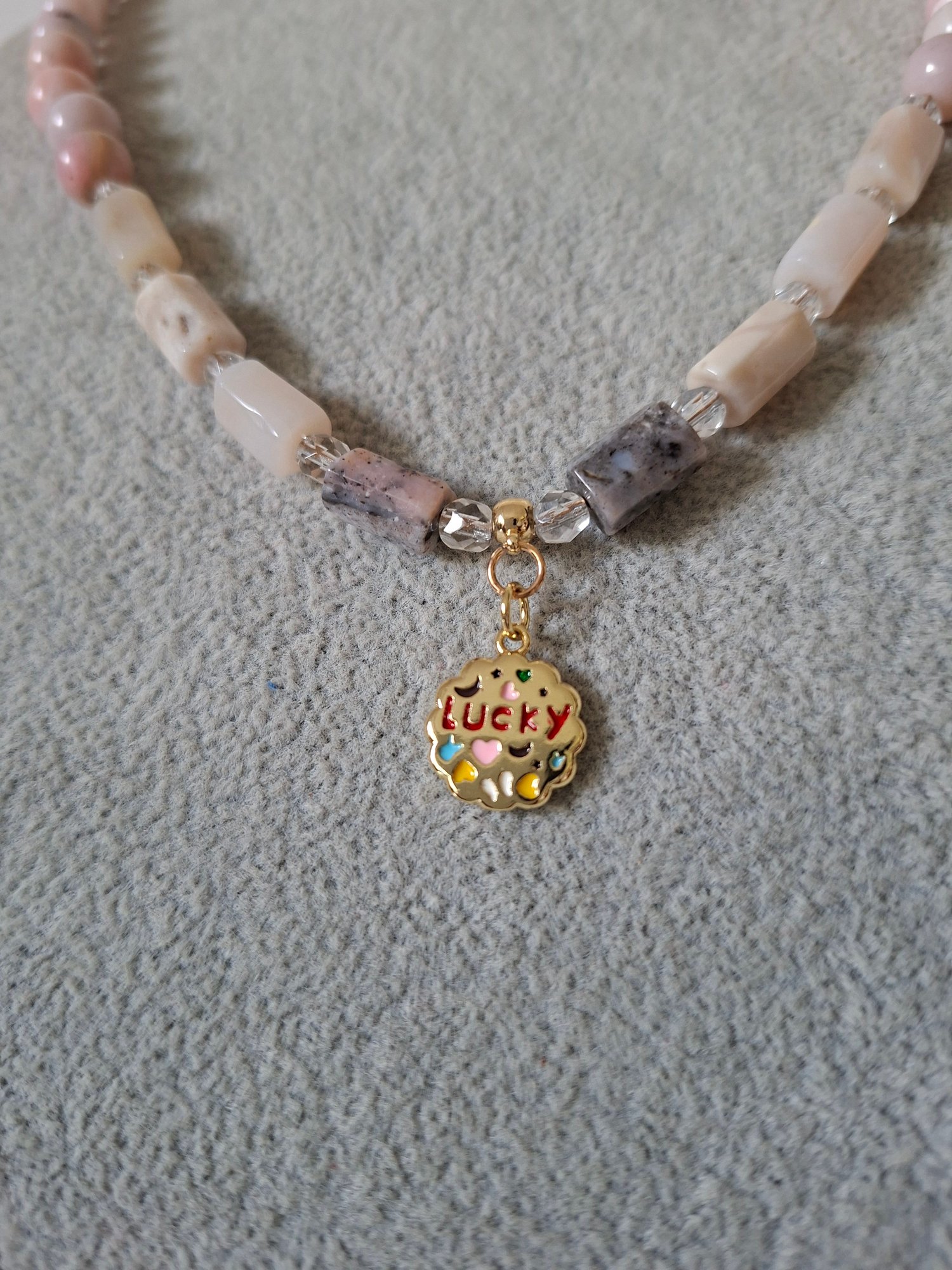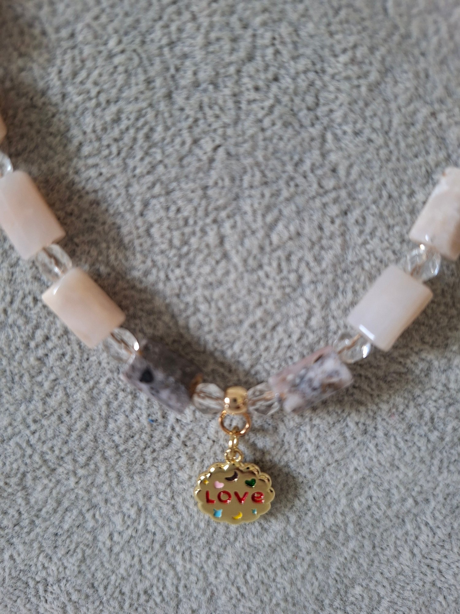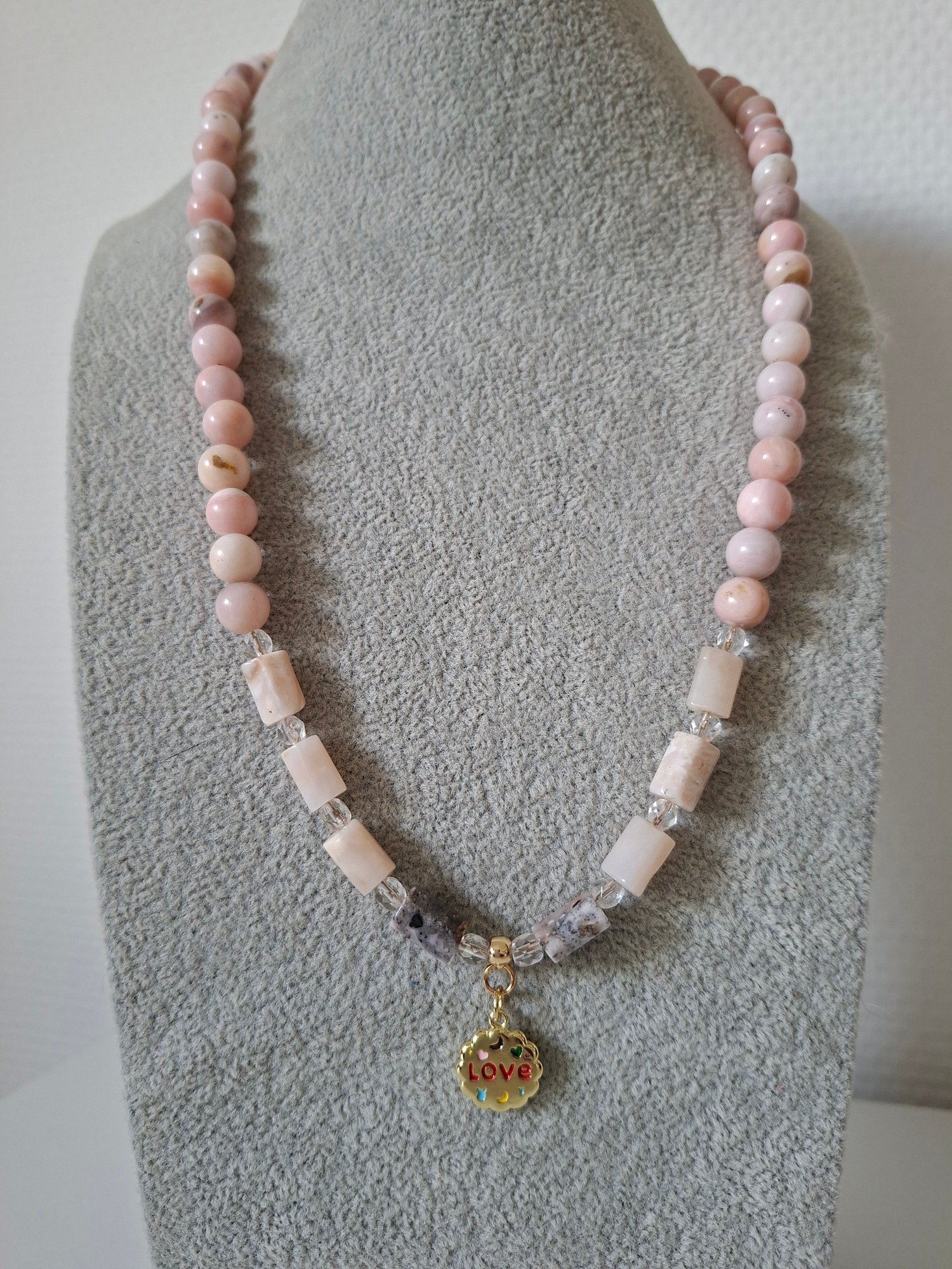 Ses perles d’opale rose naturelles en boules et en tubes, associées à un pendentif doré "LOVE", apportent une énergie réconfortante et lumineuse.