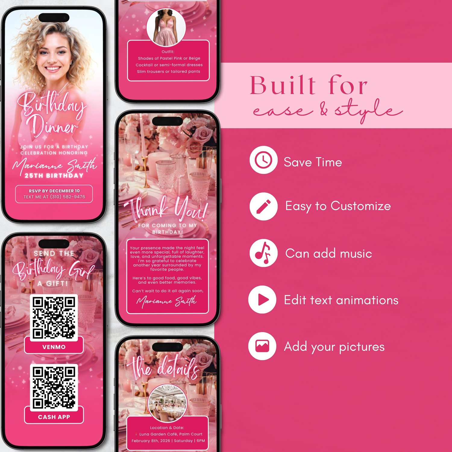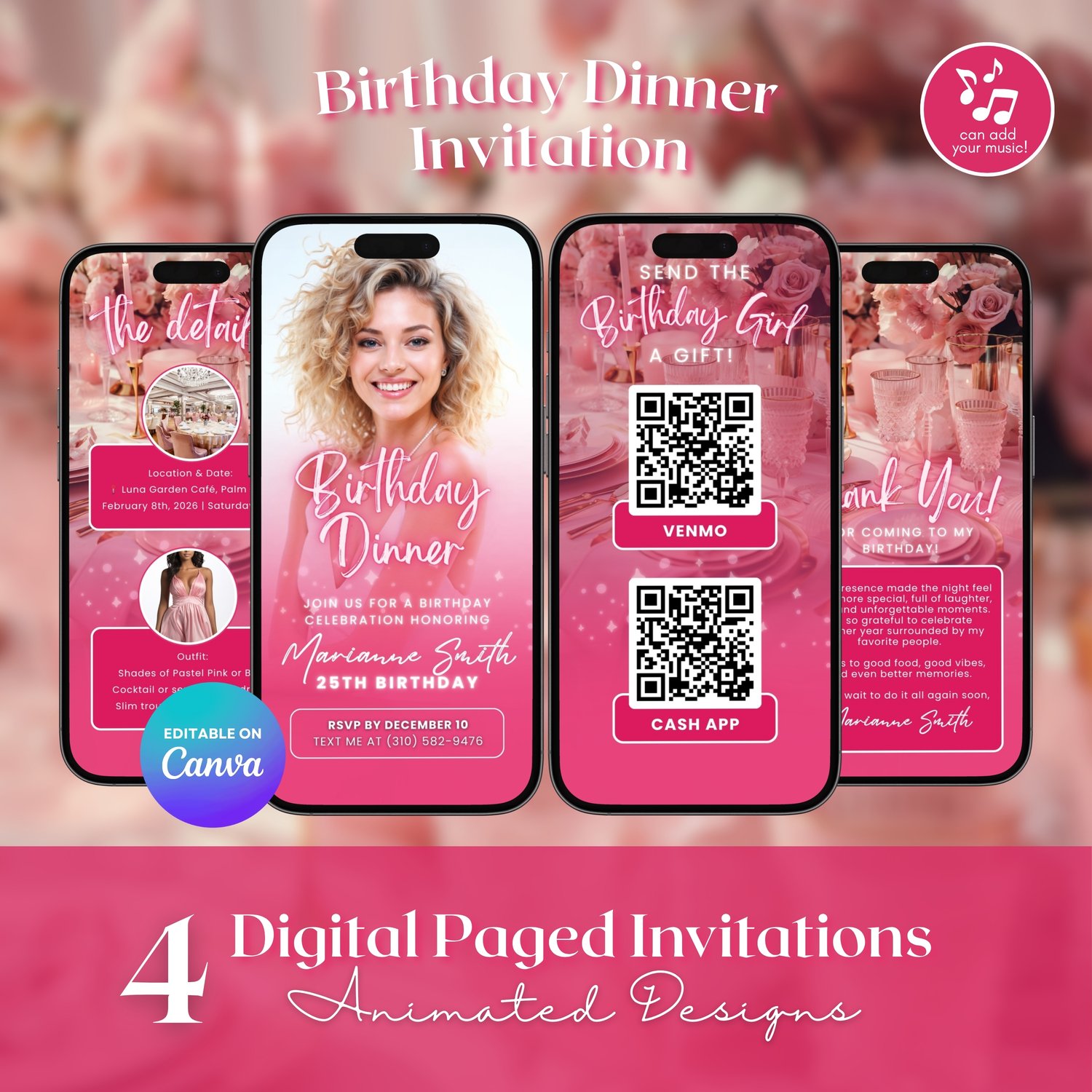 ⭐ Pink Birthday Dinner Invitation | 4 Editable Animated Mobile Canva Pages ⭐
