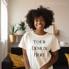 African American Woman Blank Cream Crew Neck T-shirt Mockup Photo, Stylish Apartment Background, T-shirt Mockups, Designer Mockups, Mockup Photos, Warm Color T-shirt Mockups