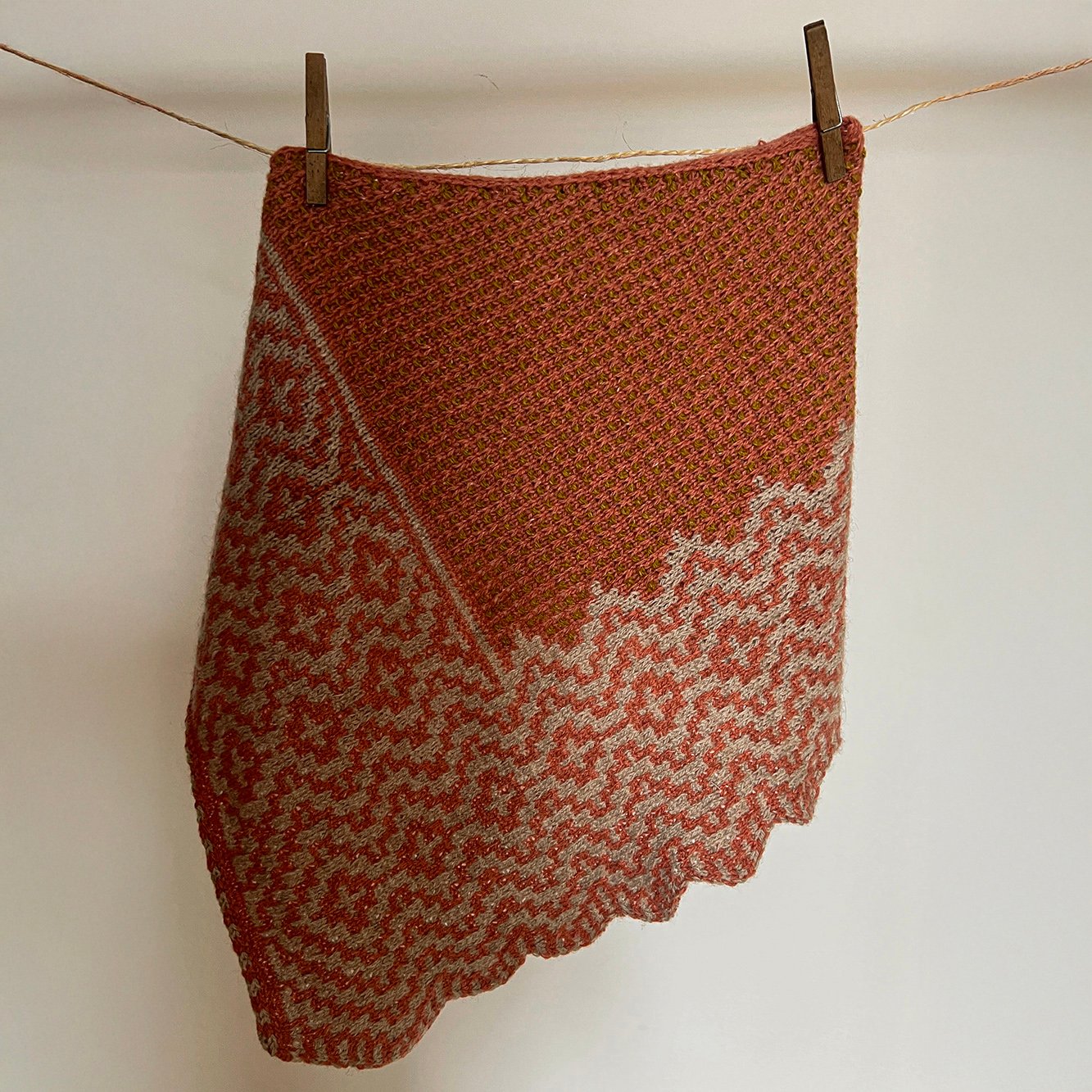 It features a technique I call Intarsia Light. On RS rows, you’ll begin with Color 1 to work the inner triangle, then switch to Color 2 for the mosaic section. On the following WS row, you’ll start with Color 2 for the mosaic and switch to Color 1 for the triangle. These two-color rows are followed by two rows worked entirely in Color 3.