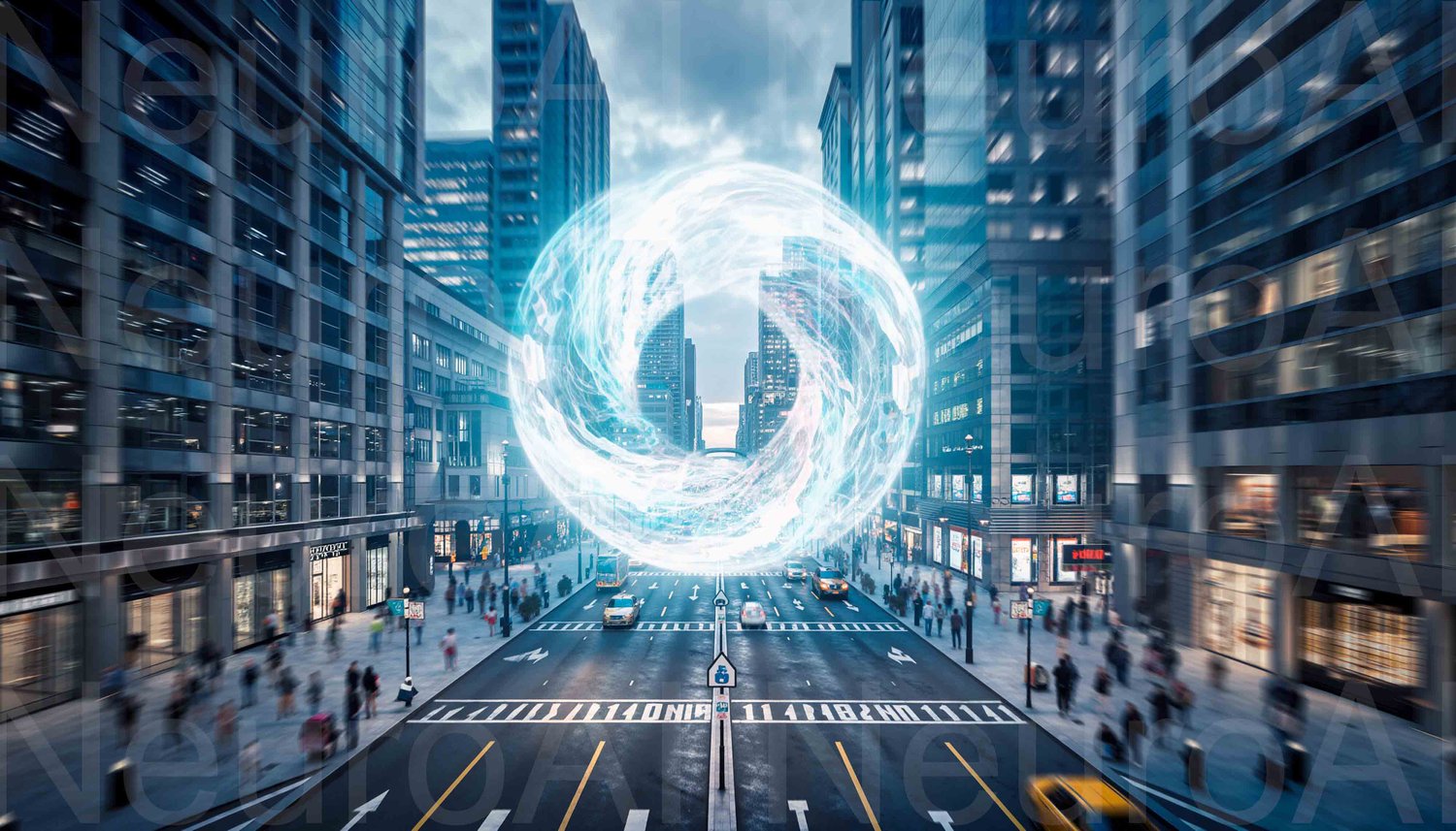 Futuristic cityscape with energy portal downtown