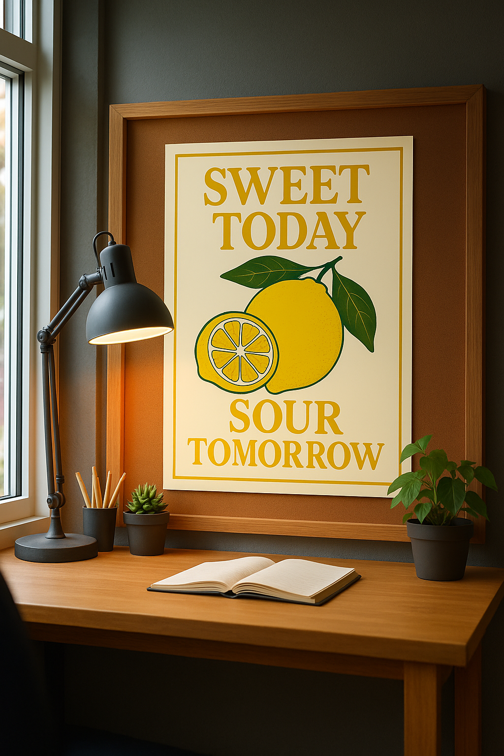 Brighten your space with a splash of citrusy charm and clever wit! This high-resolution digital poster features a bold, retro-inspired design of vibrant lemons and rich green leaves, paired with the eye-catching phrase “Sweet Today, Sour Tomorrow.” Perfect for kitchens, offices, classrooms, or anyone who appreciates a bit of cheeky wisdom, this artwork brings a playful reminder of life’s changing flavors.