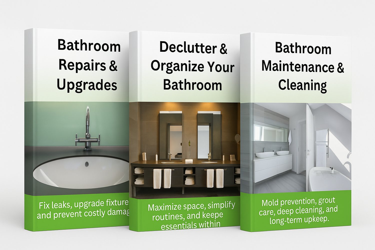 This bundle combines three essential homeowner guides, giving you the knowledge and confidence to tackle bathroom challenges head-on. Whether you’re dealing with leaks, fighting clutter, or keeping surfaces sparkling, these guides cover it all.
