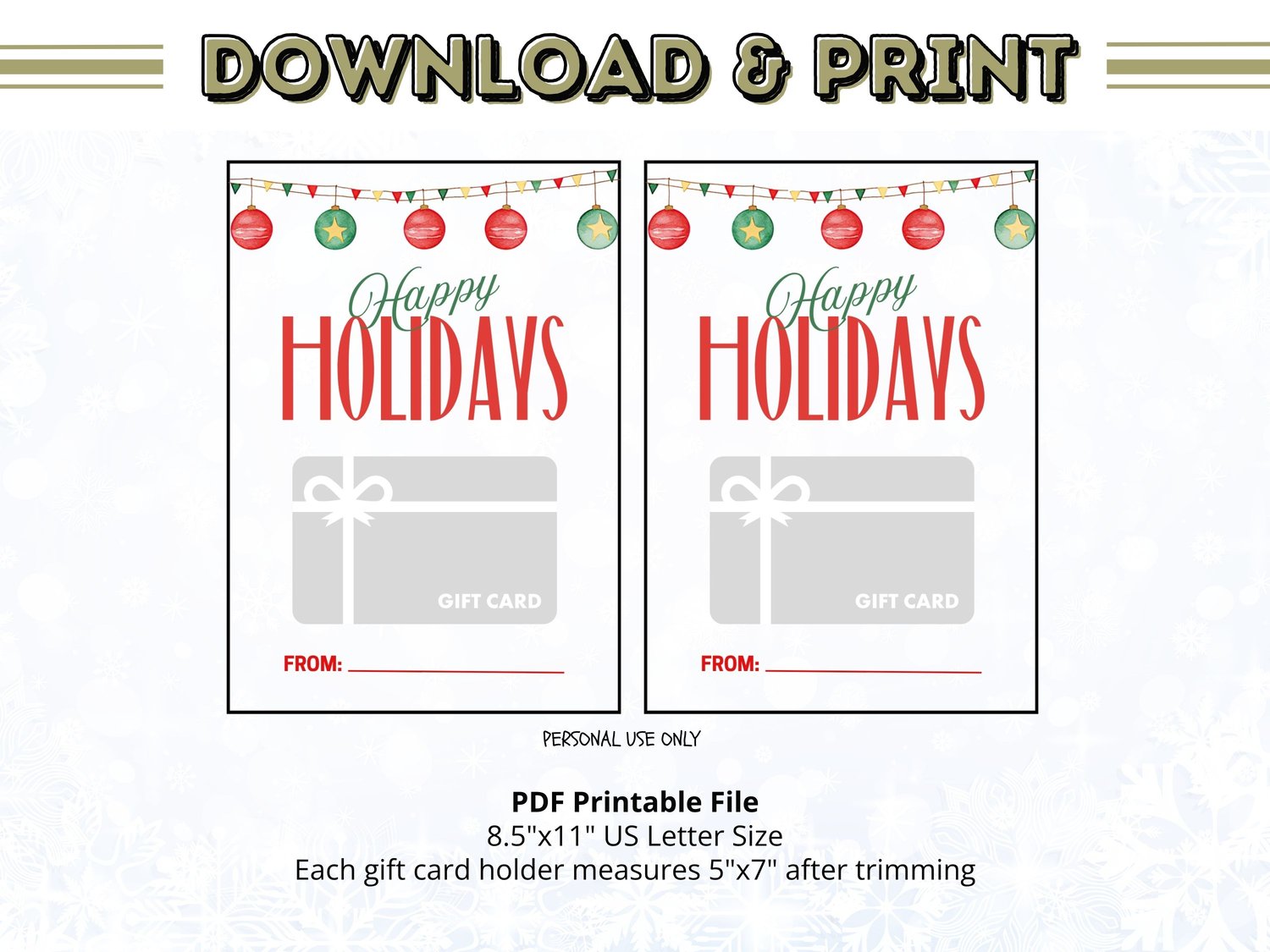 This design features a charming ornament banner, classic Christmas colors, and a bold “Happy Holidays” greeting. It’s the perfect way to dress up any gift card and add a warm, personal touch. Just print, cut, and attach your favorite gift card — a quick and thoughtful holiday gift for anyone on your list.