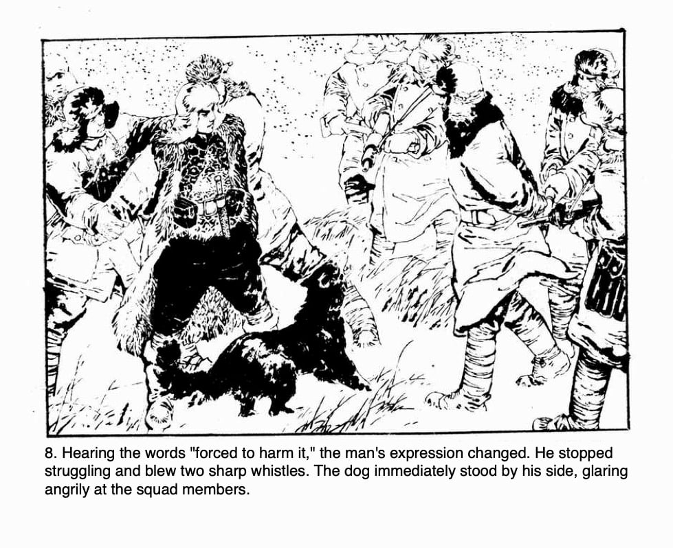 8. Hearing the words "forced to harm it," the man's expression changed. He stopped struggling and blew two sharp whistles. The dog immediately stood by his side, glaring angrily at the squad members.