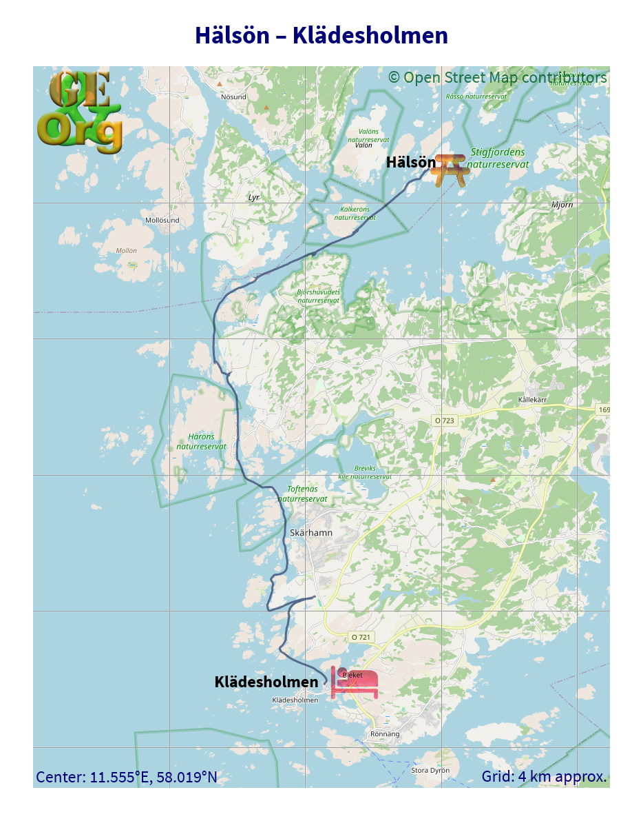 Paddling tour Hälsön to Klädesholmen, Sweden, one GPX file, one GeoJSON file, one OpenStreetMap.