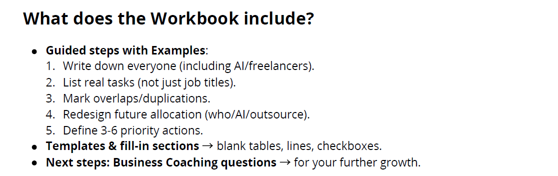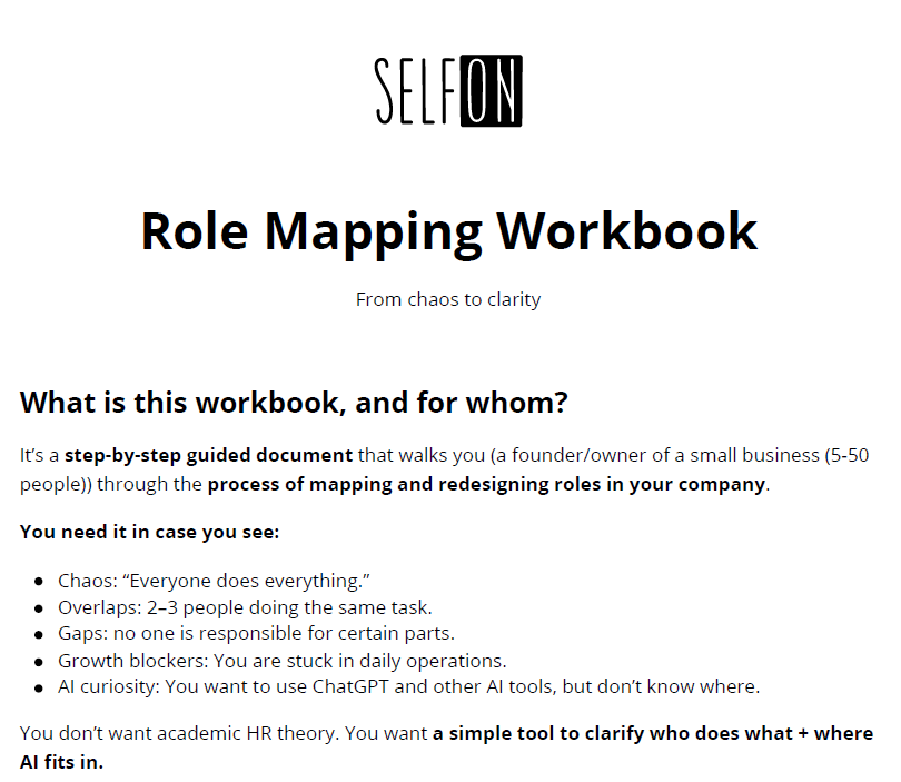 The Role Mapping Workbook helps founders and small business owners see exactly who is doing what, spot overlaps and gaps, and redesign roles for focus and growth.