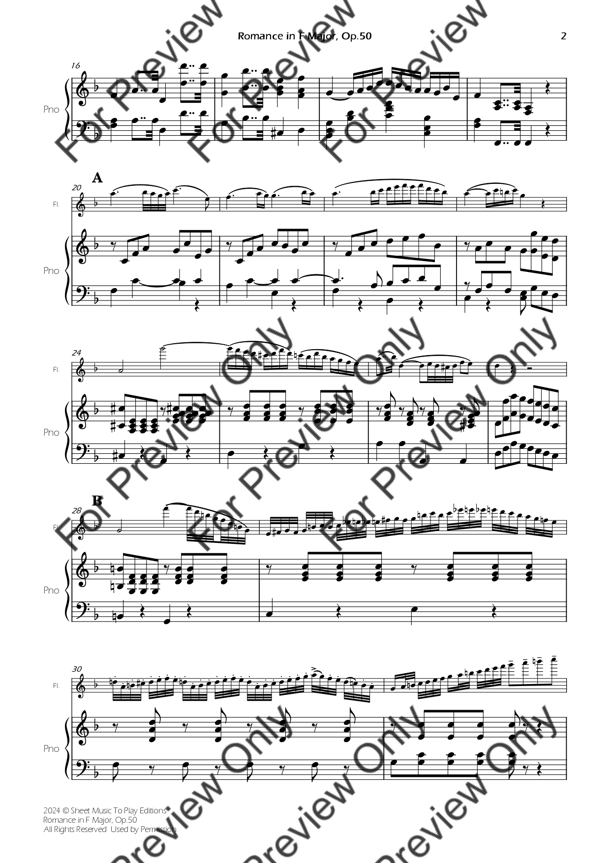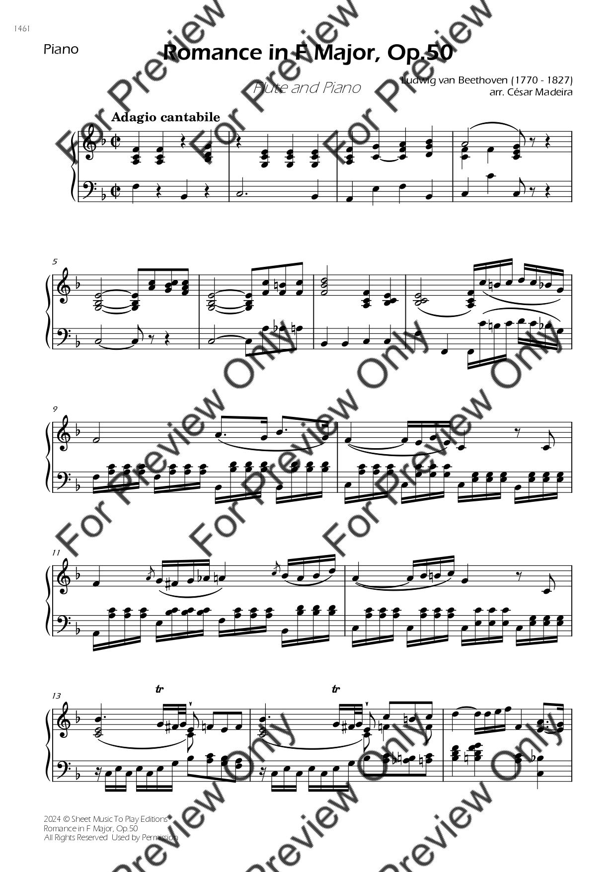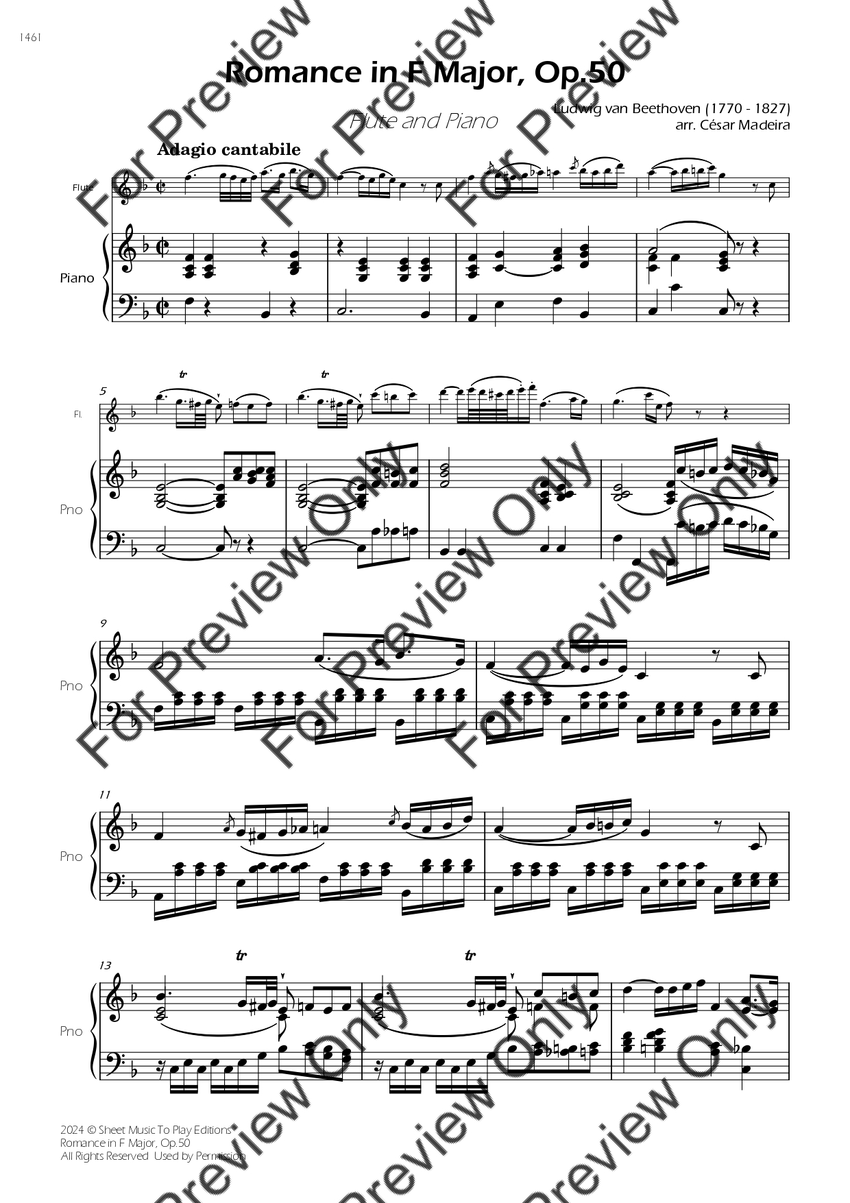 Romance in F Major, Op.50 by Ludwig Van Beethoven. Arrangement for Flute and Piano. With Full Score and Individual Parts. Have fun!