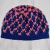Beanie is worked top down and uses two colors of worsted weight yarn (CYC 4) to make up this beautiful diamond pattern.