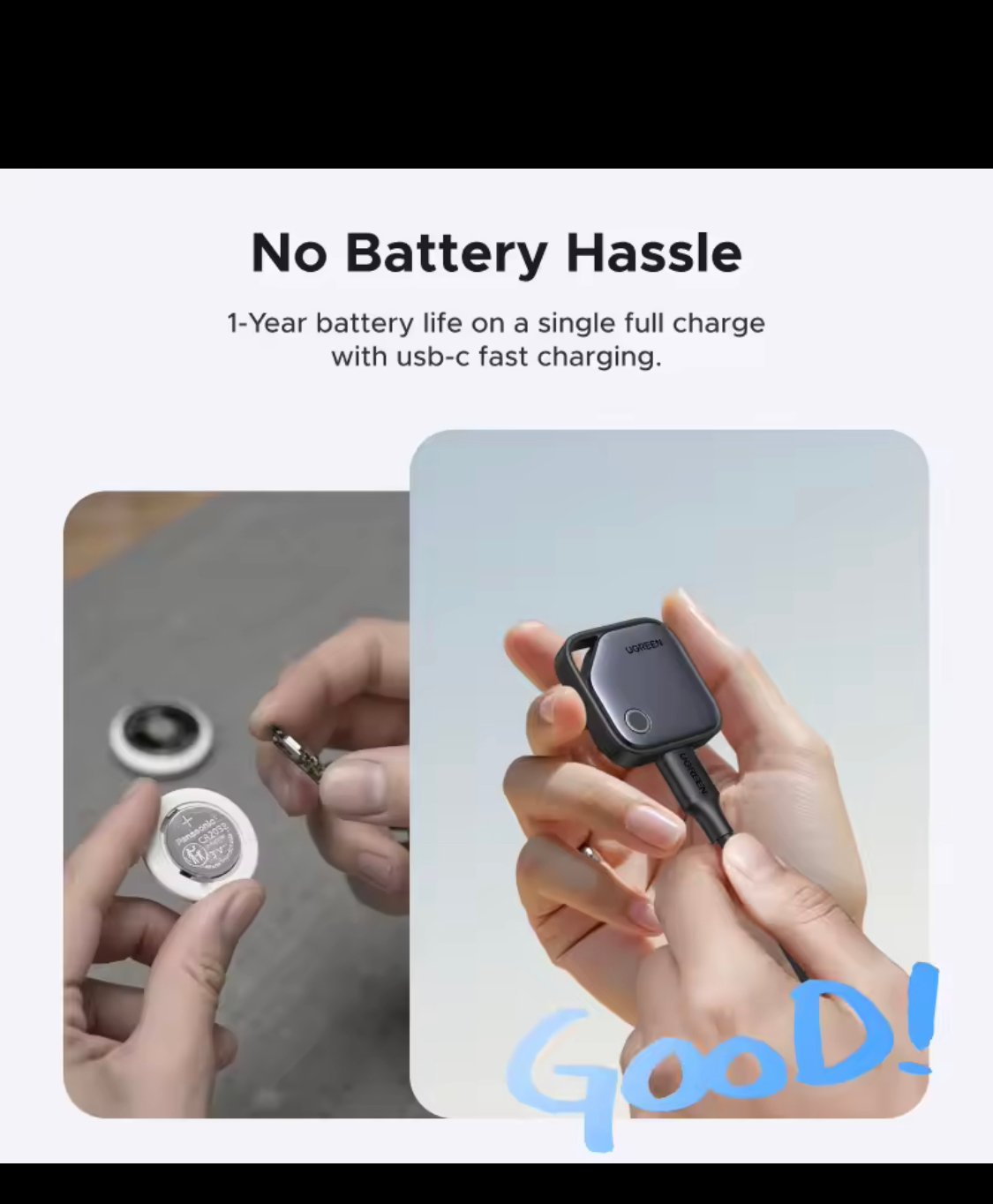 Enjoy long-lasting performance with a built-in rechargeable battery. A single USB-C charge can power the tracker for up to **12 months**, saving you money on replacements and reducing waste.