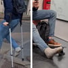 After another short episode on crutches, he reaches the doctor's office and sits down in the waiting room. There we can take a long look at his socked casted foot.