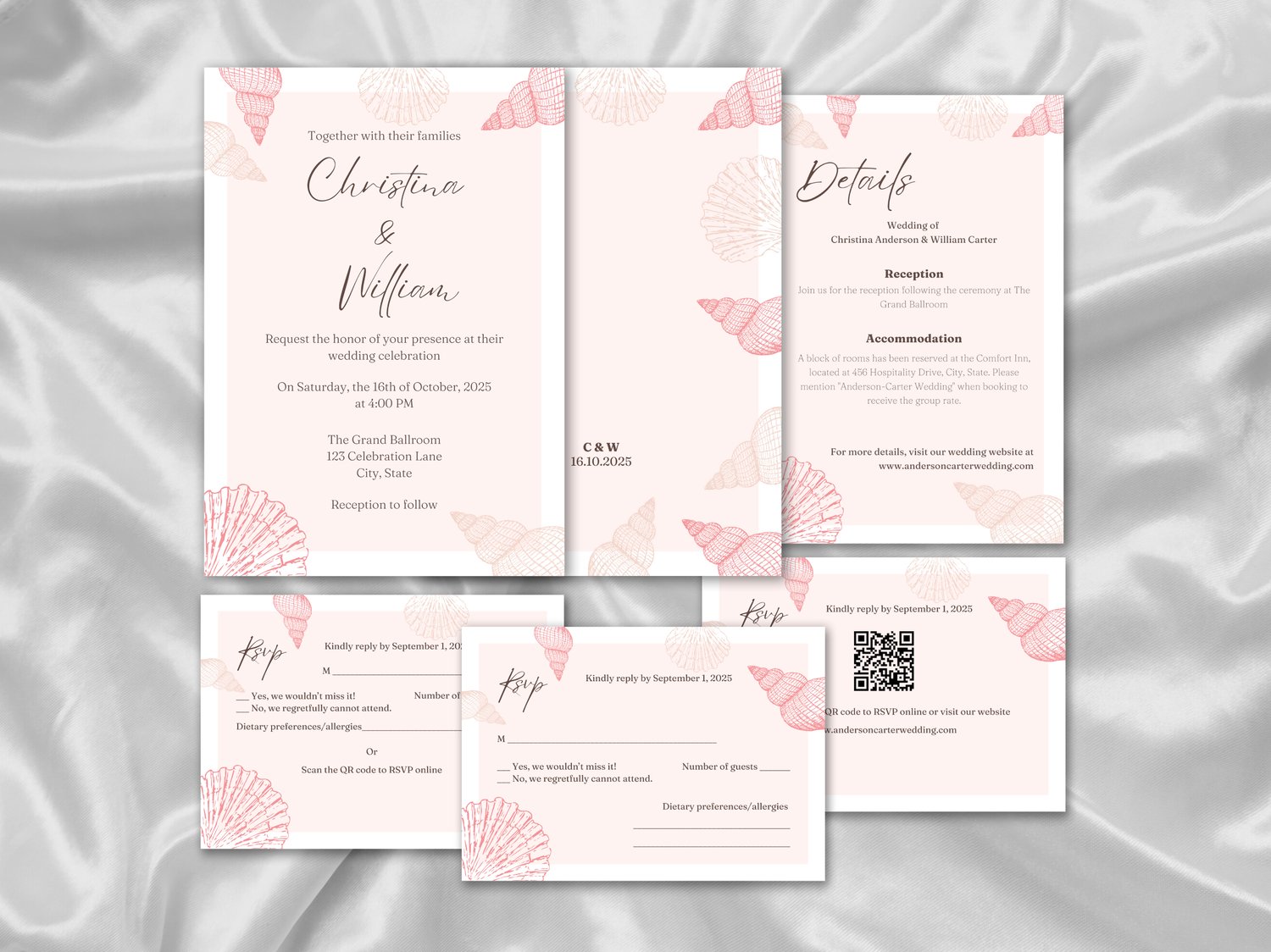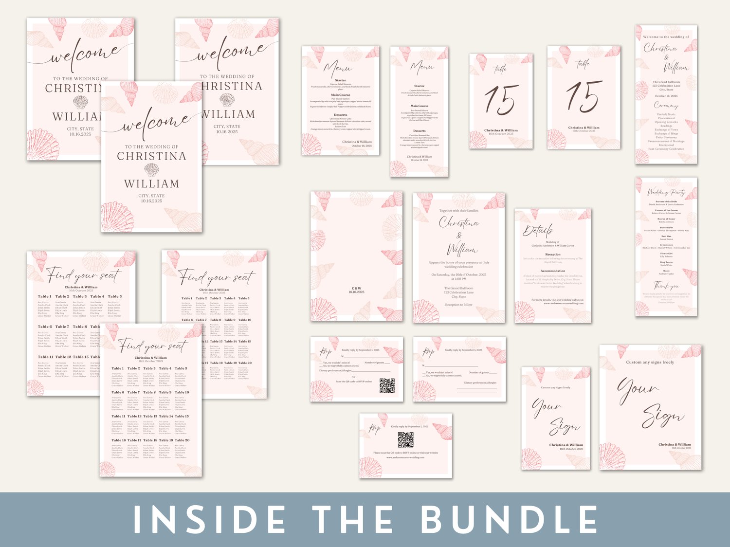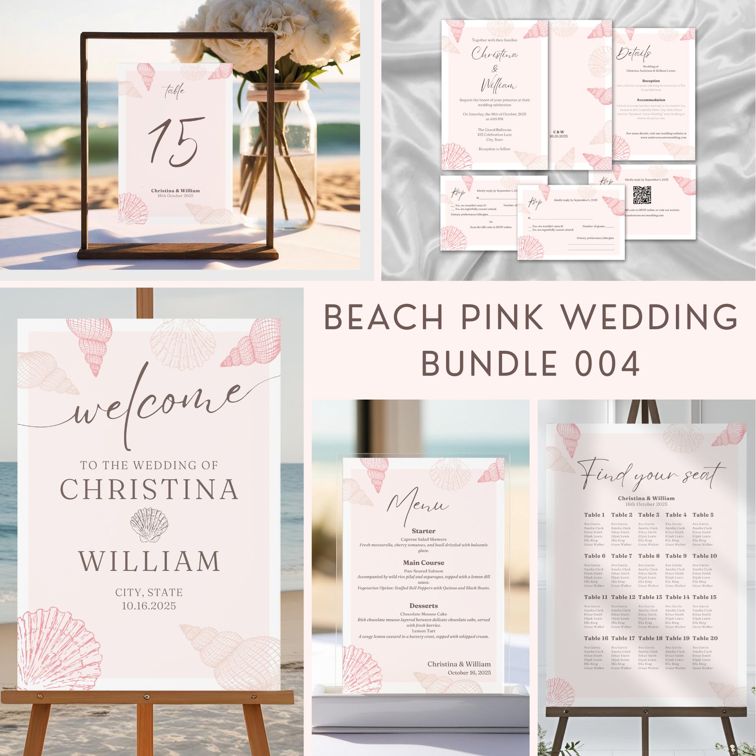 Bring coastal vibes to your day with this beach wedding bundle including a pink-theme invitation suite, welcome sign, seating chart, and others. A perfect match for tropical or seaside weddings. It’s part of our seasonal collection on NocturnePaperie—explore other seasons like Winter, Spring, and Autumn.