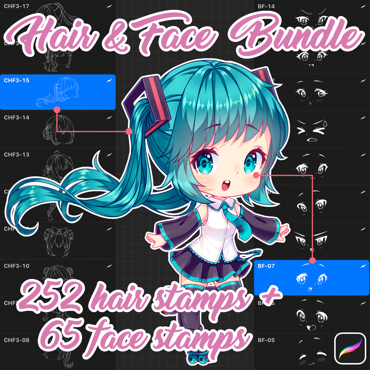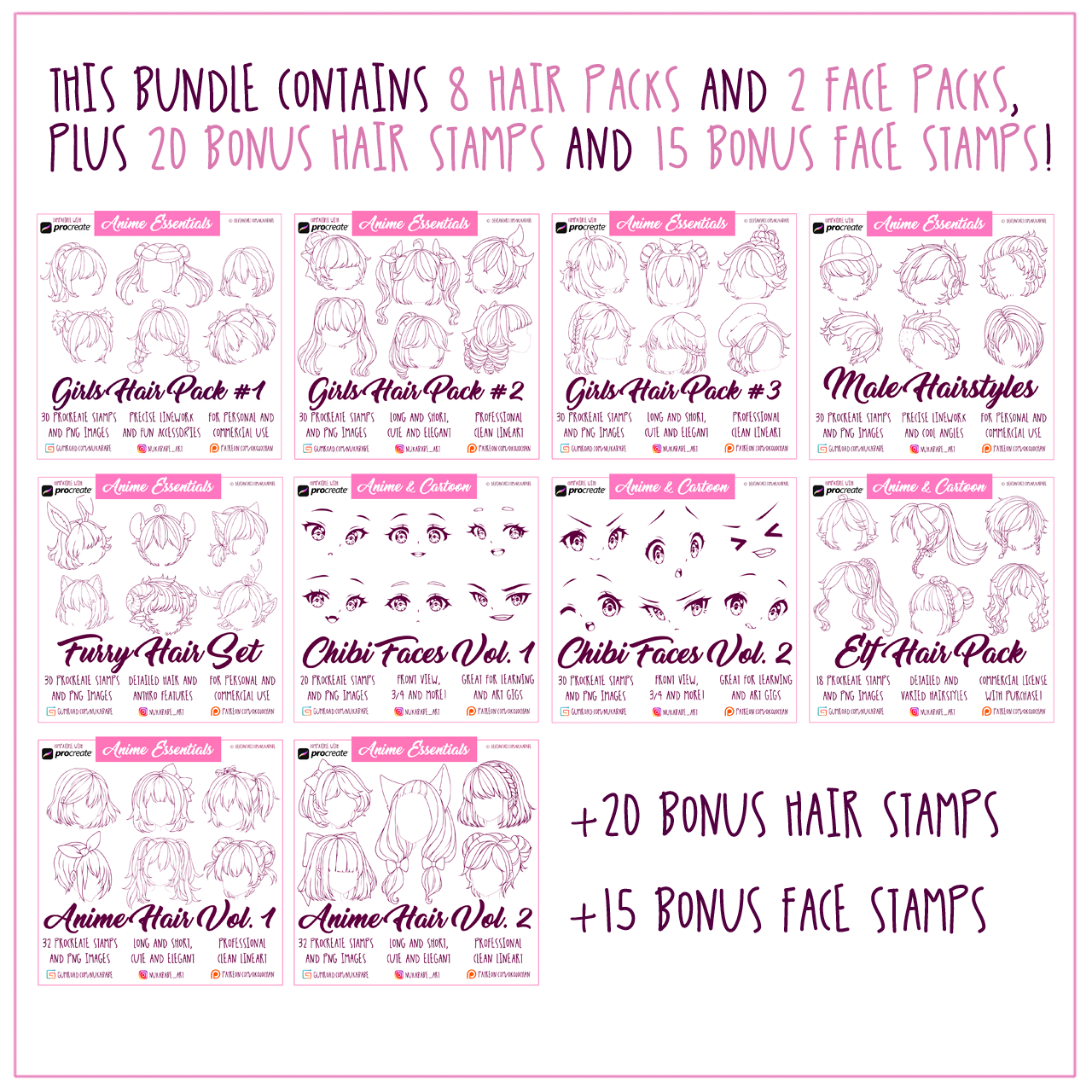 Explore and create hundreds of cute and fun combinations with this Procreate hair and face stamp bundle that includes all hair brushes and face stamps I have ever made! Inside this pack, you will find 252 hair stamps and 65 face stamps - large, crisp, and professionally developed with lots of love and attention to detail. Each stamp is available as a Procreate brush and as an individual transparent PNG file, so you can use these faces and hairstyles not only in Procreate, but also in any other drawing and painting app that supports PNG format.