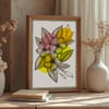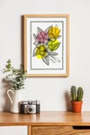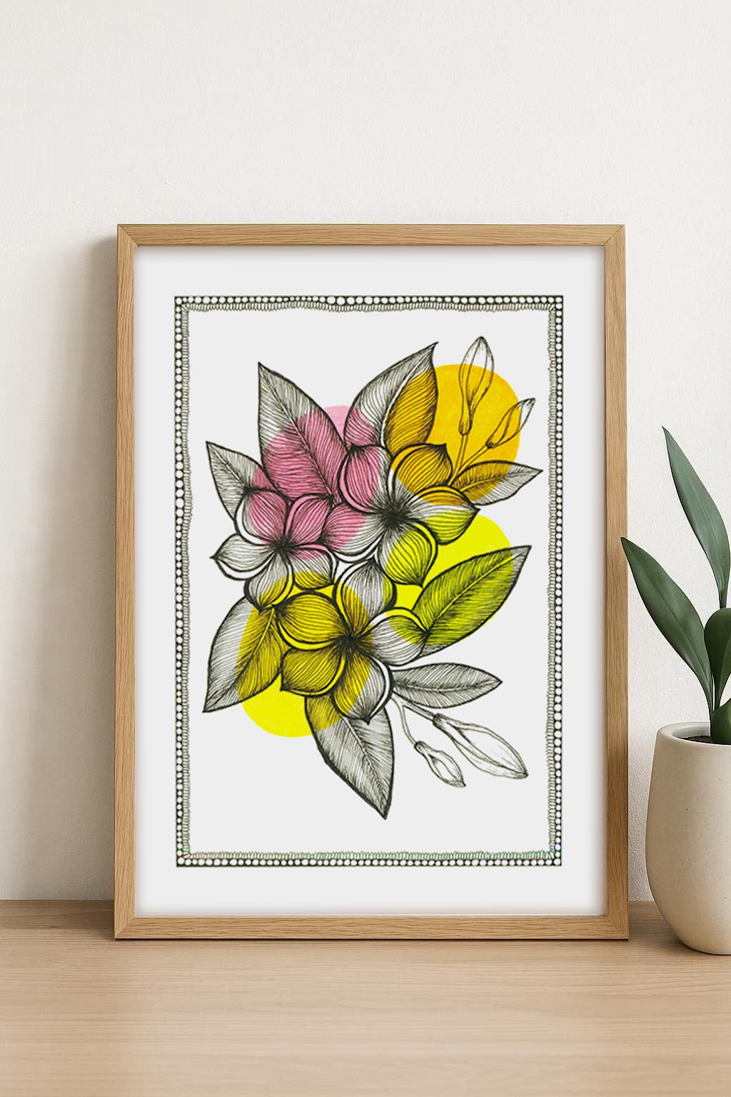 This high-resolution digital download features a delicate, hand-drawn floral arrangement with intricate line work, accented by vibrant pops of sunny yellow and soft pink. Housed in a charming hand-dotted border, this piece brings a fresh, contemporary feel to any gallery wall or home office.