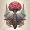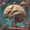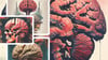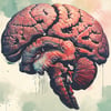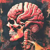 This striking, surreal artwork appears to depict the duality of intellect and primal instincts within the human mind. The vivid, almost fleshy rendering of the brain intertwined with a skull creates a powerful symbolic fusion of reason and raw animalistic drives.