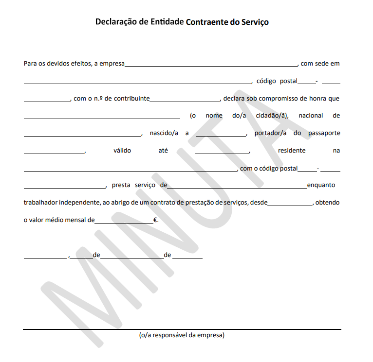 A Declaração de Entidade Contratante do Serviço é um documento formal emitido por uma empresa para atestar que um trabalhador independente presta serviços à empresa ao abrigo de um contrato de prestação de serviços. Este documento é frequentemente exigido para formalizar a relação entre a entidade contratante e o prestador de serviços, incluindo a comprovação de remuneração e outros detalhes contratuais.