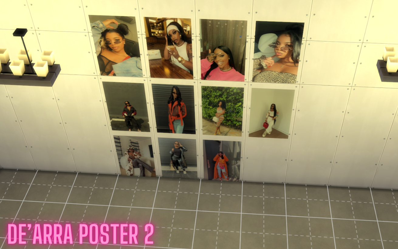 Introducing the De'arra Poster 2 for sims 4, this captivating product features a room adorned with vibrant pictures of women on the wall. Designed to enhance the ambiance of your Sims 4 game, this visually stunning poster creates a trendy and contemporary atmosphere. Transform any space in your game into a stylish haven with these striking images that effortlessly blend fashion, beauty, and art. Add a touch of elegance and sophistication to your virtual world with the De'arra Poster 2 for sims 4.