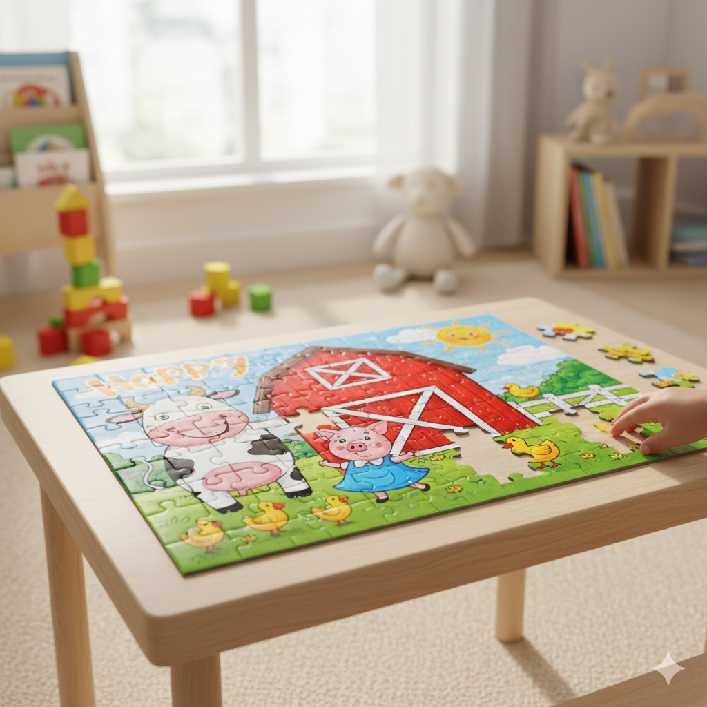 Step into a world of laughter and learning! Our "Happy Farm" Animated Puzzle is a magical journey designed specifically for little hands. Watch as your child brings a cheerful farmyard to life, featuring a smiling cow, a dancing pig, and the iconic big red barn.