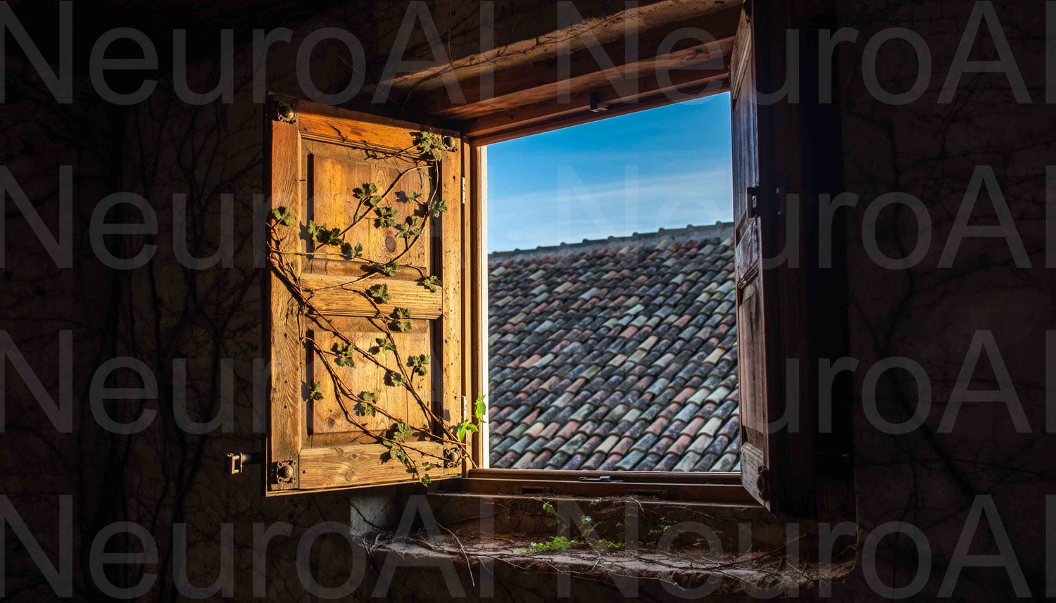 Rustic wooden window opening to bright blue skies