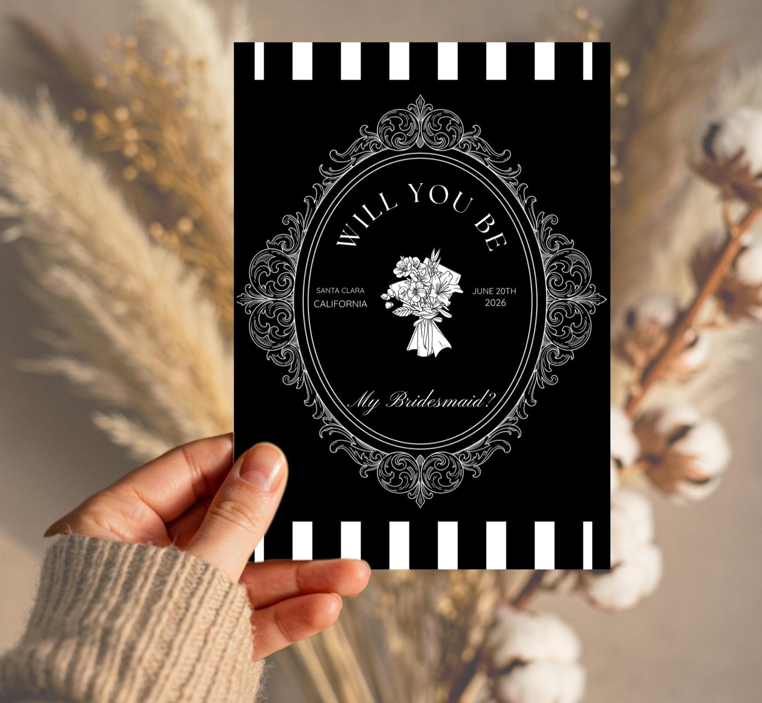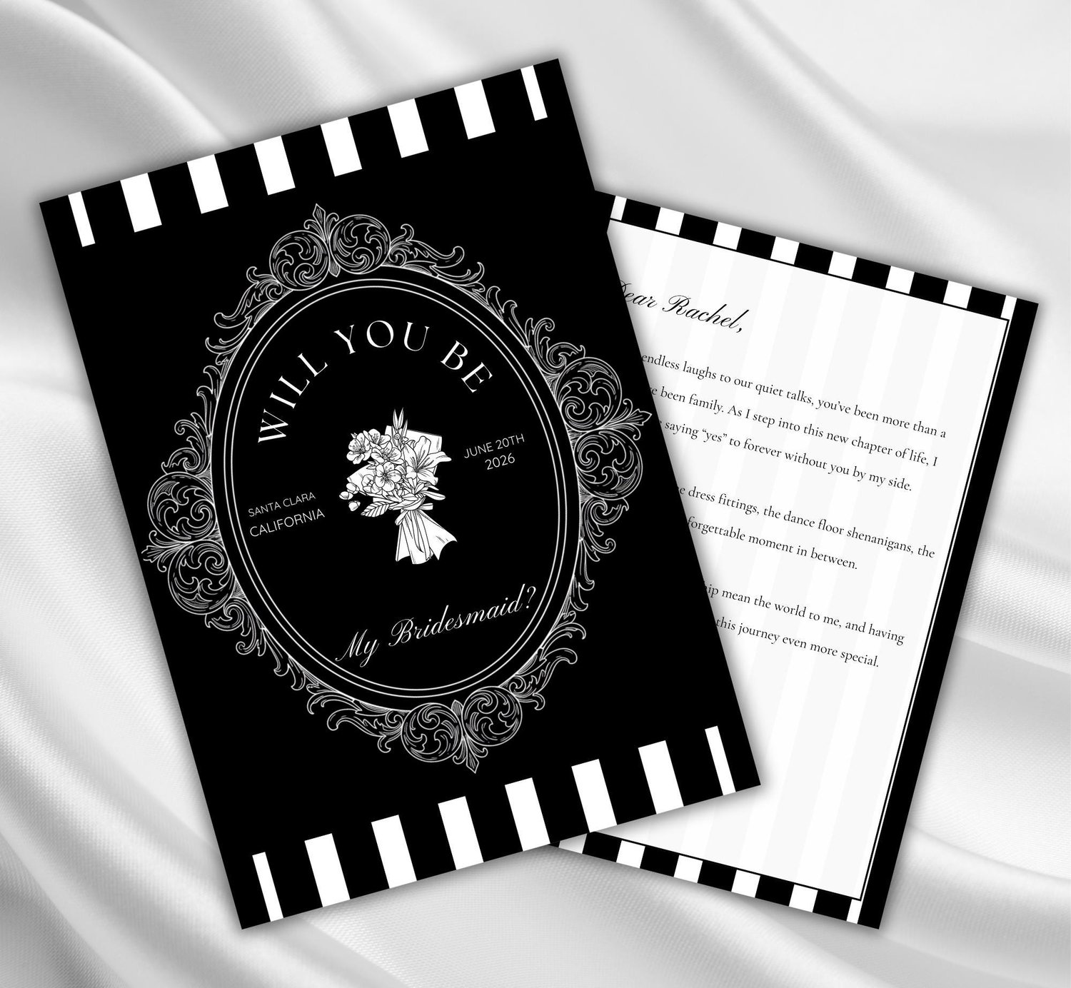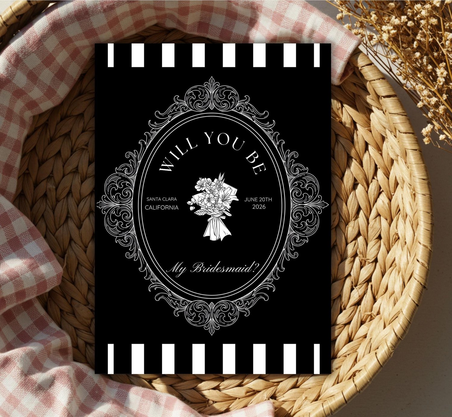Ask your girls the most important question in style with this elegant vintage bridesmaid proposal card. Featuring a bold black-and-white striped design, ornate frame details, and customizable text, this card brings a timeless, classy touch to your wedding stationery.