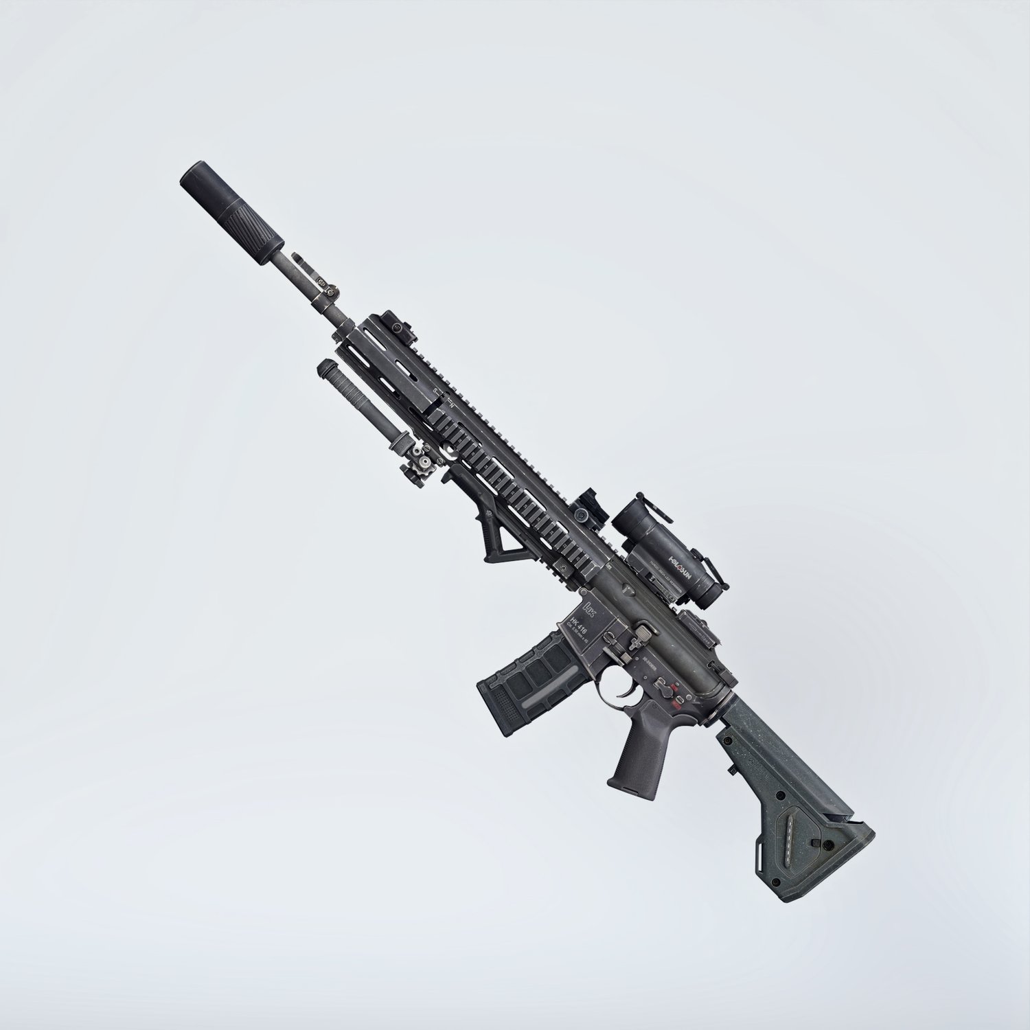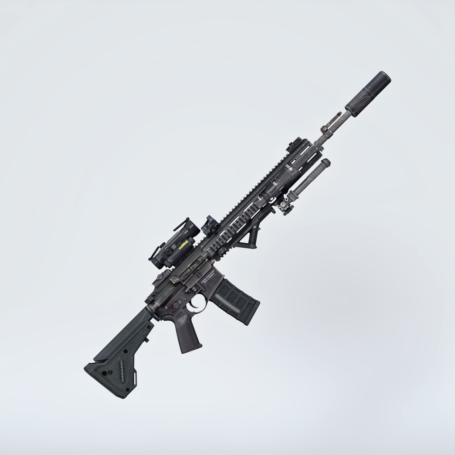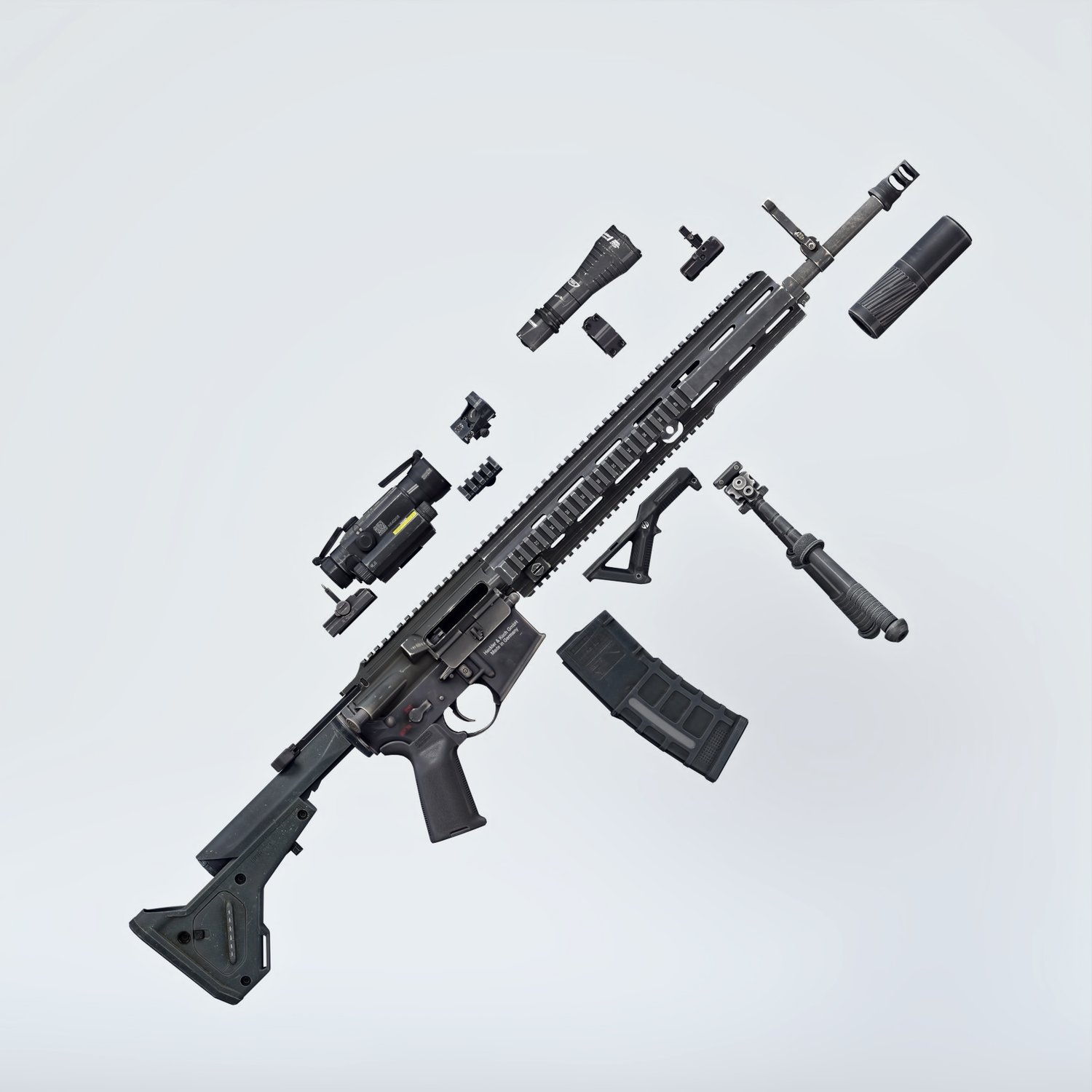 A European take on the classic AR 15 assault rifle, this time in a marksman rifle variant, for more punch and precision. Short stroke M4 platform for various military applications. German military rifle, cool looking and a good performing one. Converted and rigged for use with DAZ. Trigger, safety, bolt etc also rigged for more realistic pictures. Includes a silencer, an optic, a red dot, a light and some other accessories for various porpoises and pictures. Since parts are rigged, the gun can be used as just the basic configuration or an upgraded modern variant.
