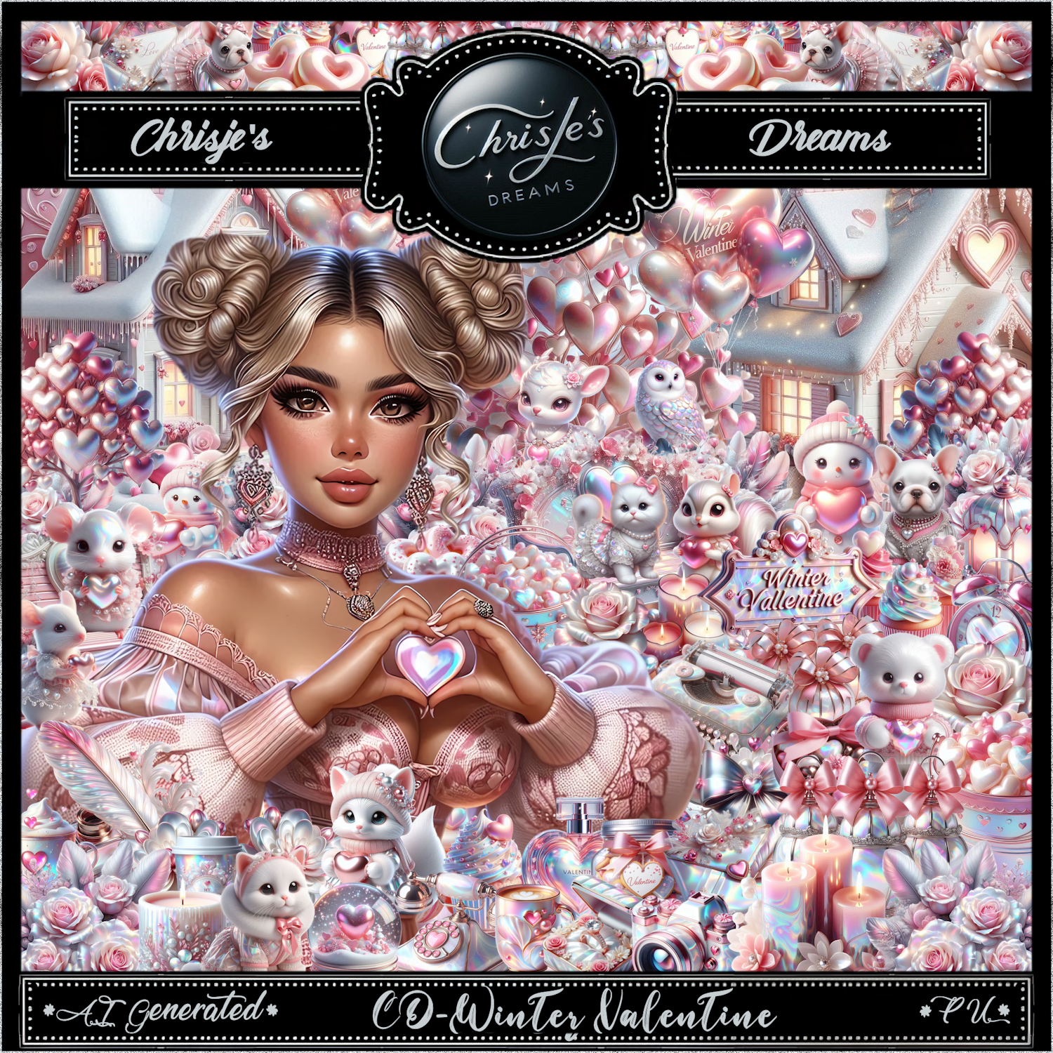 Winter Valentine is a ❤️valentine❤️ themed kit which contains 172 elements, 12 Frames, 14 papers and 2 beautiful AI generated png tubes by Chrisje's Dreams.